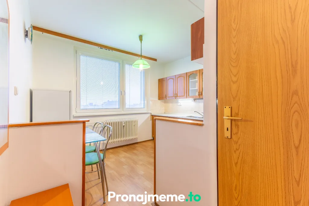 toaletou. V bytě se nachází kuchyňská linka s plynovým sporákem, lednicí, jídelním koutem a