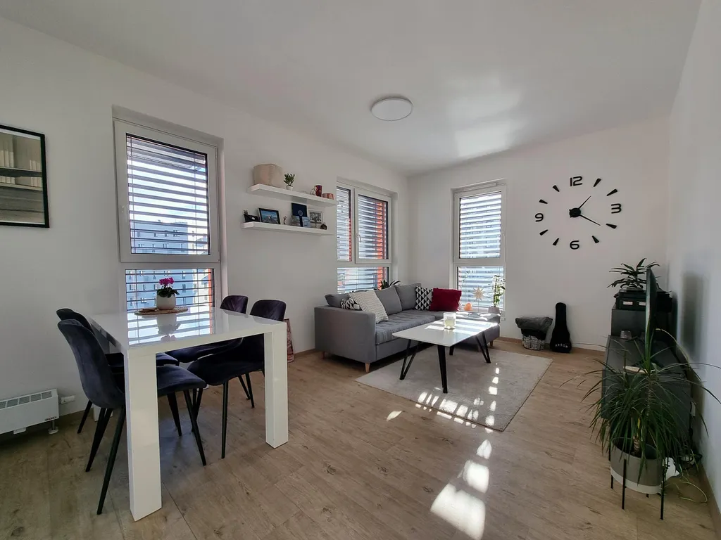 Dispozice bytu: obývací pokoj s částečně odděleným kuchyňským koutem (27 m²) - čtyři velká okna včetně balkonu (4 m²), neprůchozí ložnice (13 m²), koupelna se zděným sprchovým koutem a skleněnou zástěnou; malé okno, koupelnový nábytek, zrcadlo, přípojka na pračku 600 mm (velikost 5 m²) - podlahové vytápění, samostatné WC + umývátko, prostorná vstupní hala - předsíň (9 m²) - součástí vestavěné skříně a věšáková stěna. Součástí je prakticky řešená rohová kuchyňská linka v moderním bílo-šedém designu - vybavena indukční sklokeramickou varnou deskou, elektrickou horkovzdušnou troubou, digestoří, myčkou - vyšší standard, max. úložný systém. Venkovní - zatemňovací rolety ve všech oknech na dálkové ovládání, vkusné stropní osvětlení - dálkový ovladač, jednotný světlý odstín podlah v designu dřevo, kvalitní plastová okna (protihluk), dva výtahy v domě, dálkové vytápění. Nechybí ani bezpečná a velká sklepní kóje v suterénu domu. Slunná orientace bytu na jihozápad - vyšší podlaží je naprostou výhodou městského bydlení.