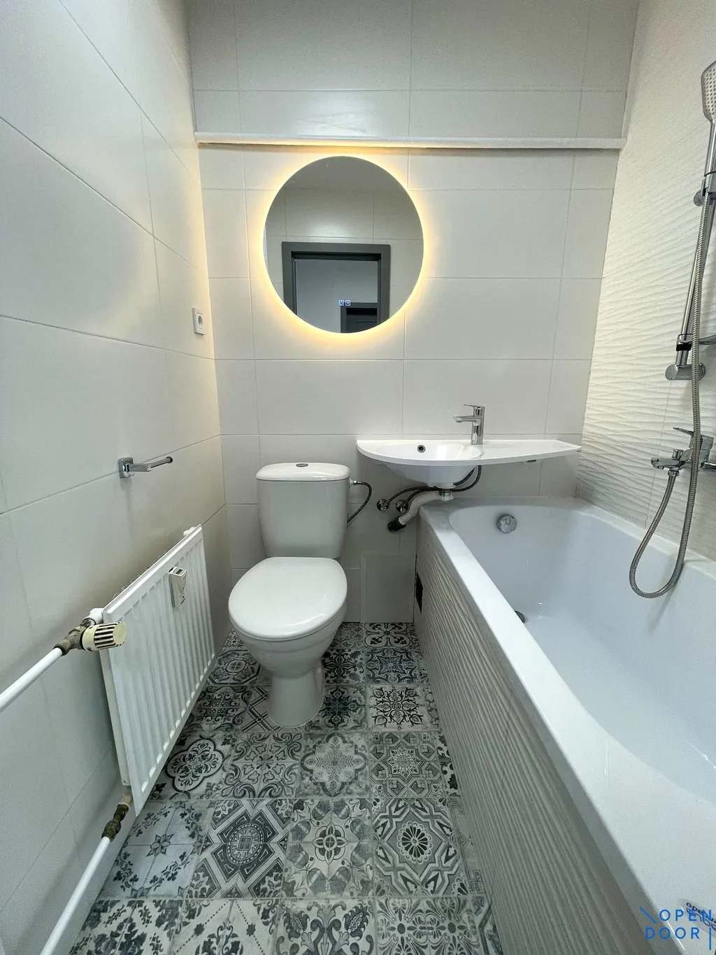 Byt prošel kompletní rekonstrukcí (podlahy, plastová okna, interiérové dveře vč. obložek, nové rozvody elektřiny, vody a odpadů) a je připraven k okamžitému nastěhování. Kuchyňská linka ve tvaru "L" je provedena v moderní šedé barvě a je vybavena vestavěnou troubou, plynovou varnou deskou, komínovou digestoří a pračkou. Koupelna je spojena s toaletou a najdete v ní vanu, umyvadlo s praktickou odkládací plochou a elegantní LED podsvícené zrcadlo se senzorem proti mlžení. I koupelna je nově a vkusně zrekonstruována.