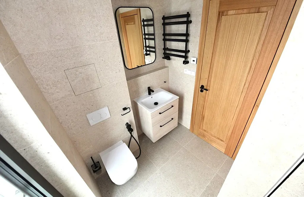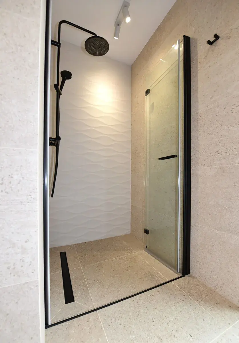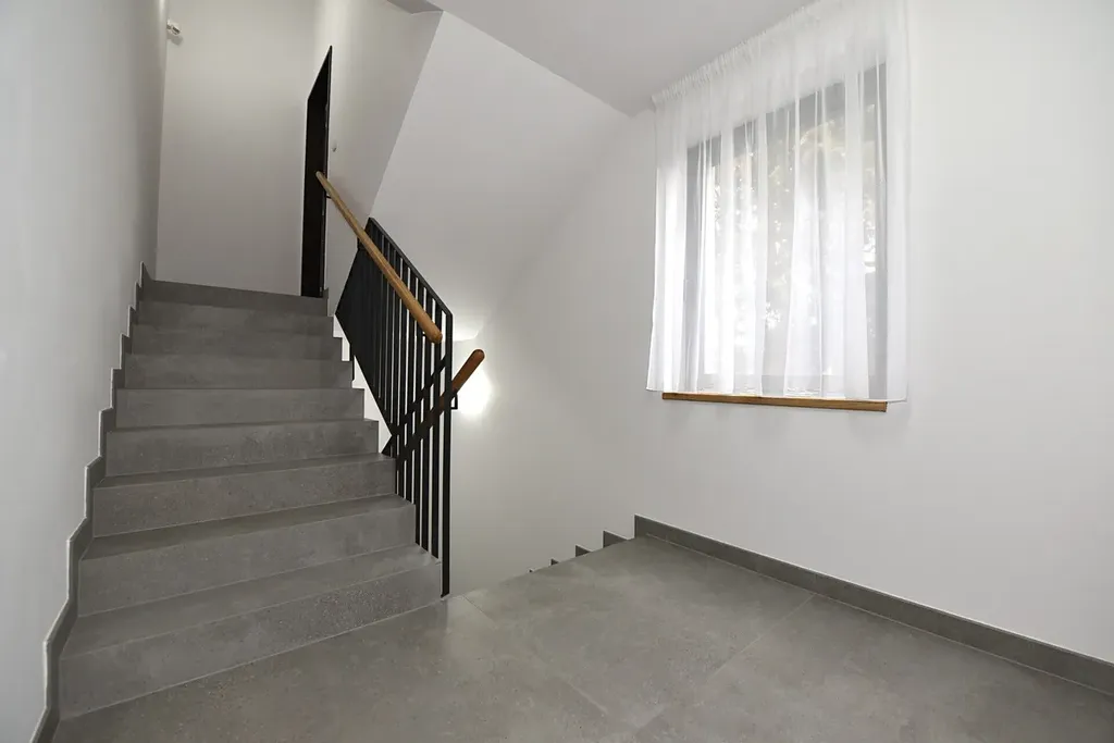 - designová koupelna zařízená velkým sprchovým koutem, multifunkční sprchou, umyvadlem s umyvadlovou skříňkou, zrcadlem, otopným žebříkem, závěsnou toaletou s bidetovou sprchou, ventilátorem s přímým odtahem zápachu z toalety, luxusní španělskou velkoformátovou kamennou dlažbou s kamenickými rohy
