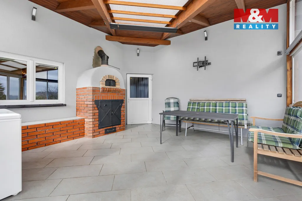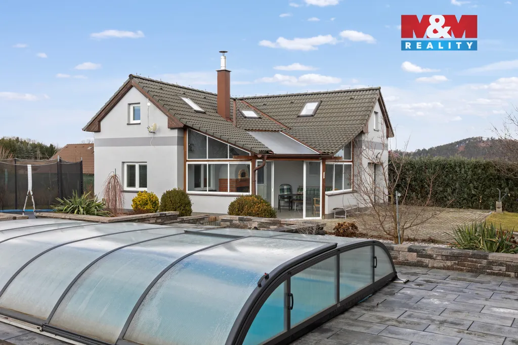 K prodeji nízkoenergetická zděná novostavba o dispozici 7+kk kolaudovaná v r. 2019. Součástí prodeje je další zděná stavba na pozemku bez č.p/č.ev o dispozici 3+kk, která byla kolaudovaná v r. 2009. Hlavní stavba je napojena na IS: plyn, elektřina, veřejný vodovod a veřejná kanalizace. Na pozemku pak studna kopaná, na střeše fotovoltaika na ohřev vody. V celém domě vytápění podlahou. V 1. NP se nachází zádveří s vestavěnou skříní, obývací místnost s krbem a vstupem na zahradu, kuchyň s kuch. linkou + vestavěné spotřebiče, 2 pokoje, koupelna se sprchovým koutem, toaleta, komora, garáž. Ve 2. NP jsou 4 pokoje, 2 koupelny, tech. místnost, 2 toalety. Druhou stavbu je možno vytápět krbovými kamny s výměníkem nebo elektrickým kotlem. V 1. NP krytá pergola s krbem, který slouží také jako udírna a pec na pizzu. Vstupní chodba, obývací místnost s kuch. koutem, koupelna s toaletou, schodiště a garáž. Ve 2. NP 2 pokoje, toaleta a úložný prostor. Na zahradě bazén, skleník. V blízkosti Český kras.