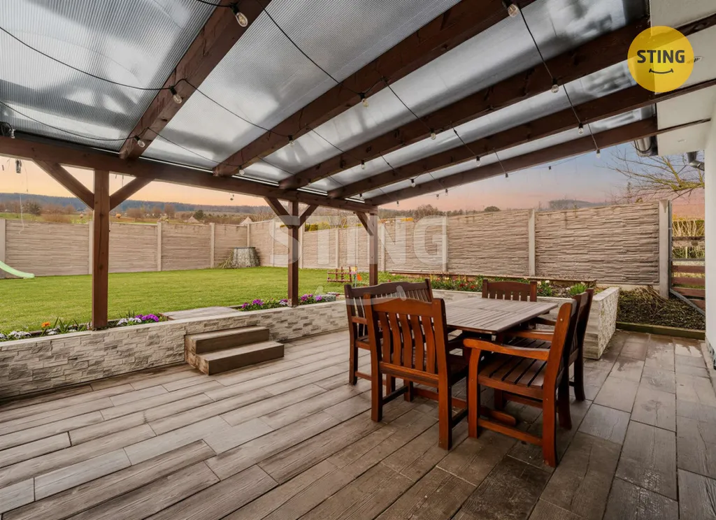 Dispozice domu : vstupní chodba, tři samostatné ložnice, koupelna, technická místnost a prostorný obývací pokoj s kuchyní. Z obývací části je přímý vstup na krytou terasu a navazující zahradu – ideální pro relax i rodinná setkání. Vytápění zajišťuje úsporný kondenzační kotel napojen na podlahové topení, v obývacím pokoji je navíc krb pro příjemnou atmosféru a doplňkový zdroj tepla.