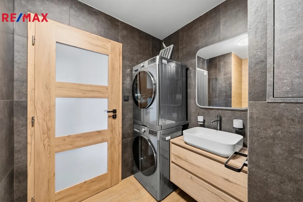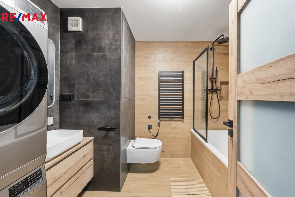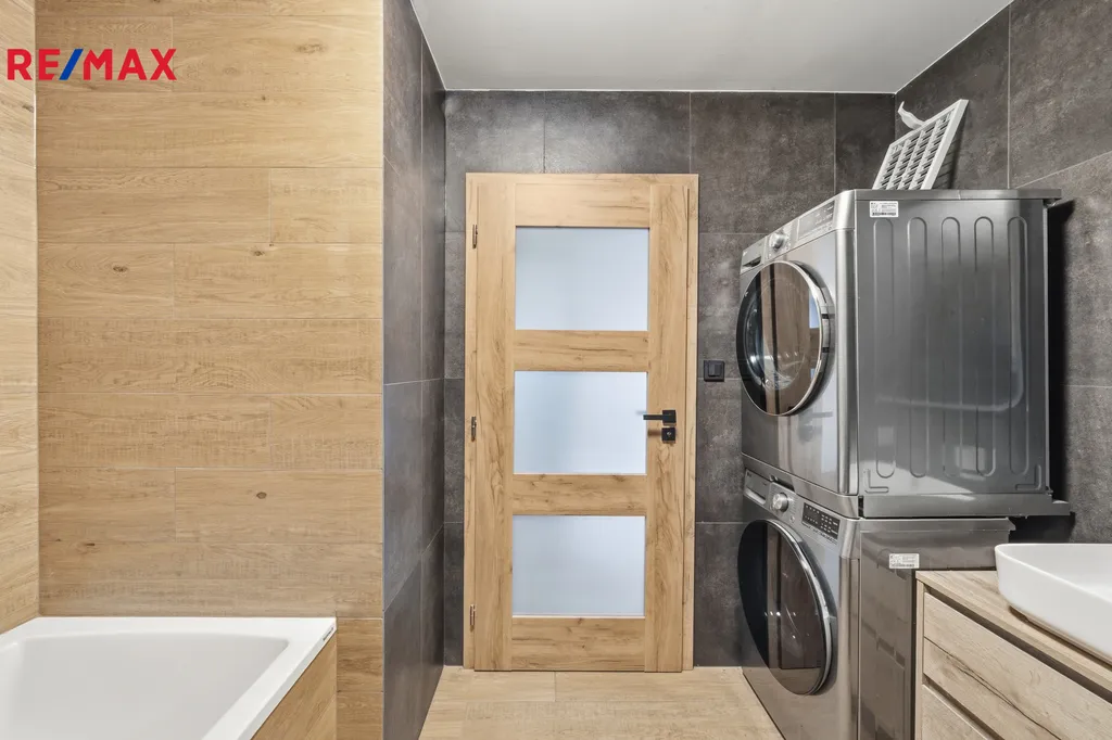 Koupelna navržená koupelnovým studiem Syrový byla rozšířena a nabízí komfortní prostor s vanou, WC, umyvadlem a místem pro pračku i sušičku. Nechybí ani topný žebřík. Kuchyňská linka je vyrobena na míru truhlářem ve tvaru L a je vyvedena až ke stropu, což zajišťuje maximální úložný prostor. Kuchyň je vybavena vestavěnou digestoří, sklokeramickou varnou deskou, elektrickou troubou, myčkou nádobí a prostorem pro volně stojící lednici. Kuchyň je prostorná a nabízí prostor pro jídelní stůl.