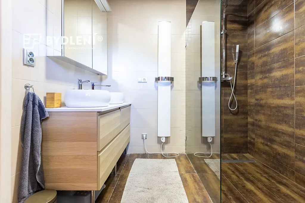 Designová koupelna s dvojicí umyvadel a moderním walk-in sprchovým koutem je oddělená od samostatného WC. Prostorná a okny prosvětlená vstupní hala má po celé délce samostatný uzavřený prostor, který nabízí nadstandardní úložné prostory a samostatnou část vyhrazenou pro technologické zázemí bytu, kde se nachází moderní kondenzační plynový kotel se zásobníkem na TUV a také pračka a sušička.