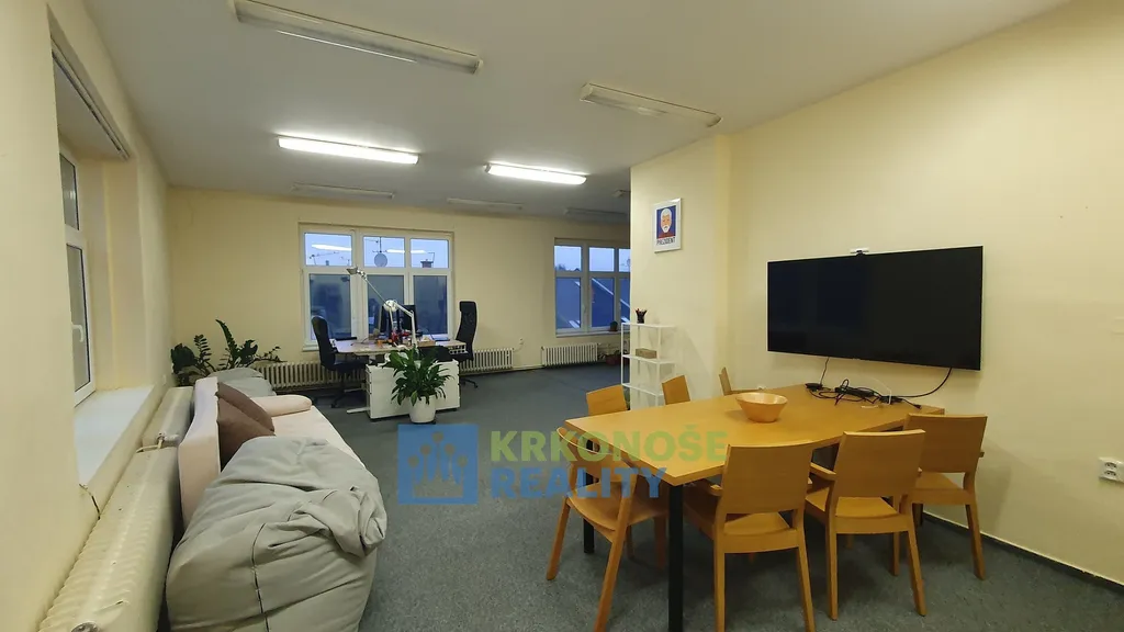 Nabízíme K pronájmu nabízíme místnost - kancelář o celkové výměře 56m² a s vlastním soc. zařízením, ve 3. nadzemním podlaží v Pražské ulici, v Trutnově, bez výtahu. Prostor je využitelný jako kancelář, ateliér, jednací místo, apod. Kancelář je zařízena částečně. Kancelář se nachází v centru města hned nad Krakonošovým náměstím. Prostory mají velká okna, s výhledem na hory, proto je dostatek světla a klid na práci. Nájemné 6.500,- Kč/měsíc a záloha na služby 6.000 Kč/měsíc tj. služby a energie (elektřina, voda, topení, úklid chodba, popelnice).