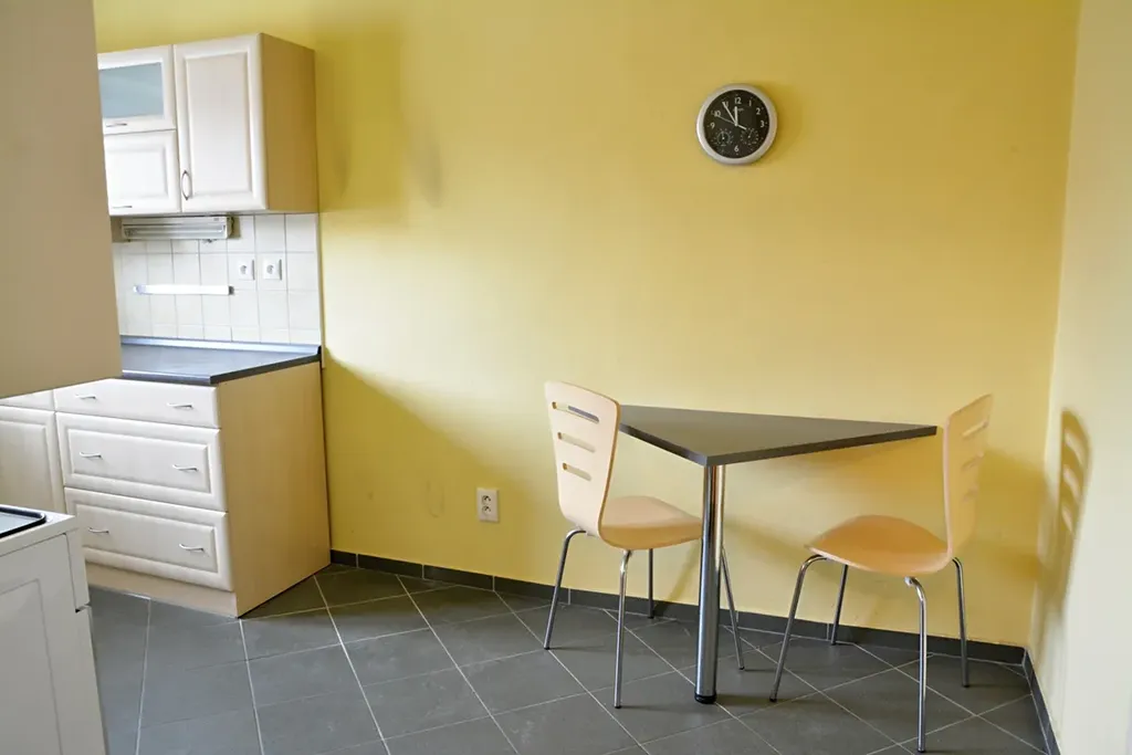 Dispozice bytu: velká předsíň s úložnými prostory, samostatné WC, koupelna i kuchyně. U kuchyně dále samostatná spíž s oknem. Dále jsou zde dvě obytné místnosti, kde jsou revitalizovány parkety (obývací pokoj i ložnice). V předsíni, kuchyni včetně koupelny i WC je dlažba.