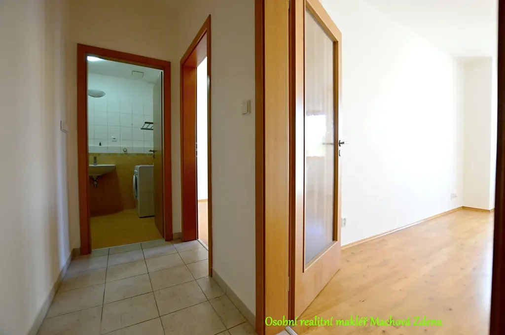 Dispozice bytu 2kk s balkonem nabízí prostorný obývací pokoj (33,5 m²) se vstupem na balkon a kuchyňským koutem vybaveným moderní kuchyňskou linkou a vestavěnými spotřebiči (lednice s mrazákem, elektrická trouba, myčka, varná deska, digestoř). Ložnice (15,2 m²) má rohové okno s příjemným výhledem do okolí. Koupelna (4,3 m²) je vybavena vanou a pračkou, toaleta (1,2 m²) je samostatná. V předsíni (4,3 m²) se nachází vstup do praktické komory (2,5 m²). Podlahy tvoří plovoucí podlaha a dlažba. Vytápění a ohřev vody jsou řešeny dálkově v rámci bytového komplexu. Součástí nájmu je také sklep. K bytu je možné pronajmout kryté garážové stání v 1. podzemním podlaží domu za 1 500 Kč měsíčně. Díky kvalitnímu zateplení a moderním oknům má budova nízké náklady na vytápění. Energetická náročnost budovy je třídy B – velmi úsporná.