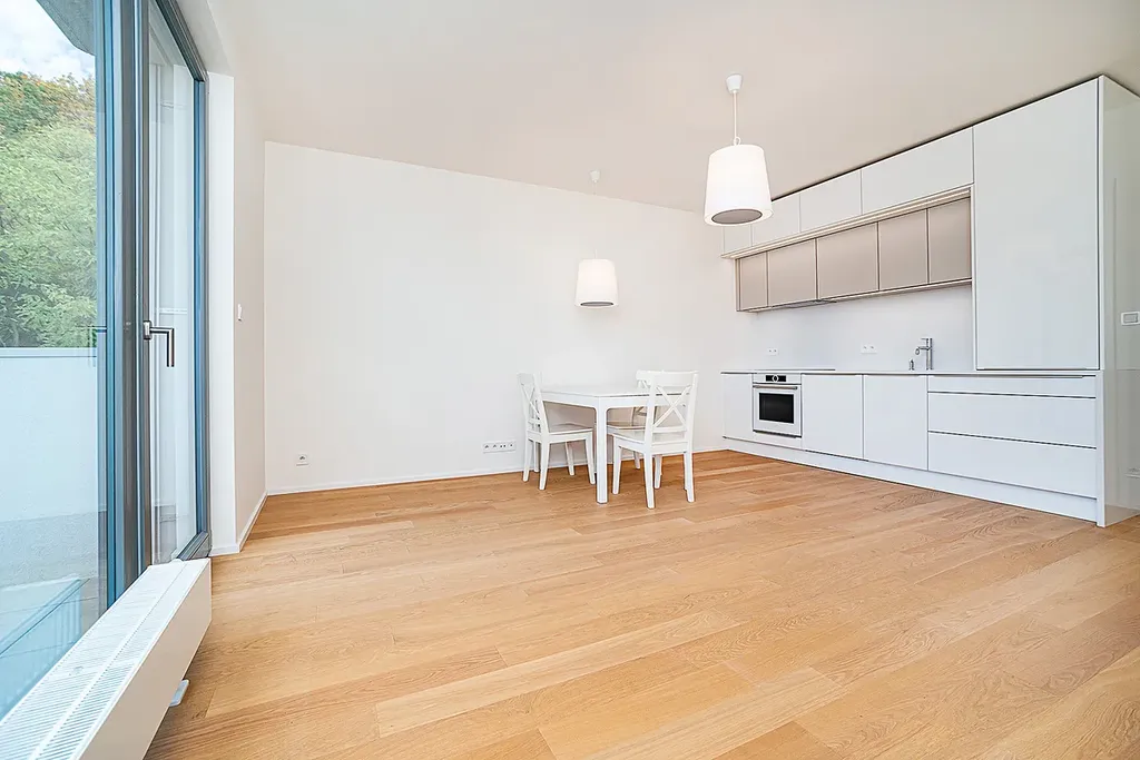 Dispozice bytu nabízí ložnici s manželskou postelí a samostatnou šatnou s vestavěnými skříněmi. Dominantou ložnice je velké francouzské okno s krásným výhledem přímo na skálu. Obývací část je propojena s kvalitně řešeným kuchyňským koutem v lakovaném provedení, s kamennou pracovní i obkladovou deskou Technistone. Kuchyně je plně vybavena vestavěnými spotřebiči – myčkou nádobí, velkou lednicí s mrazákem, indukční varnou deskou, digestoří a nabízí dostatek úložného prostoru.