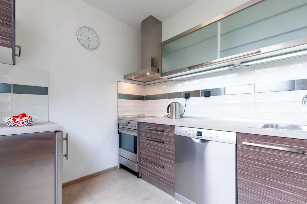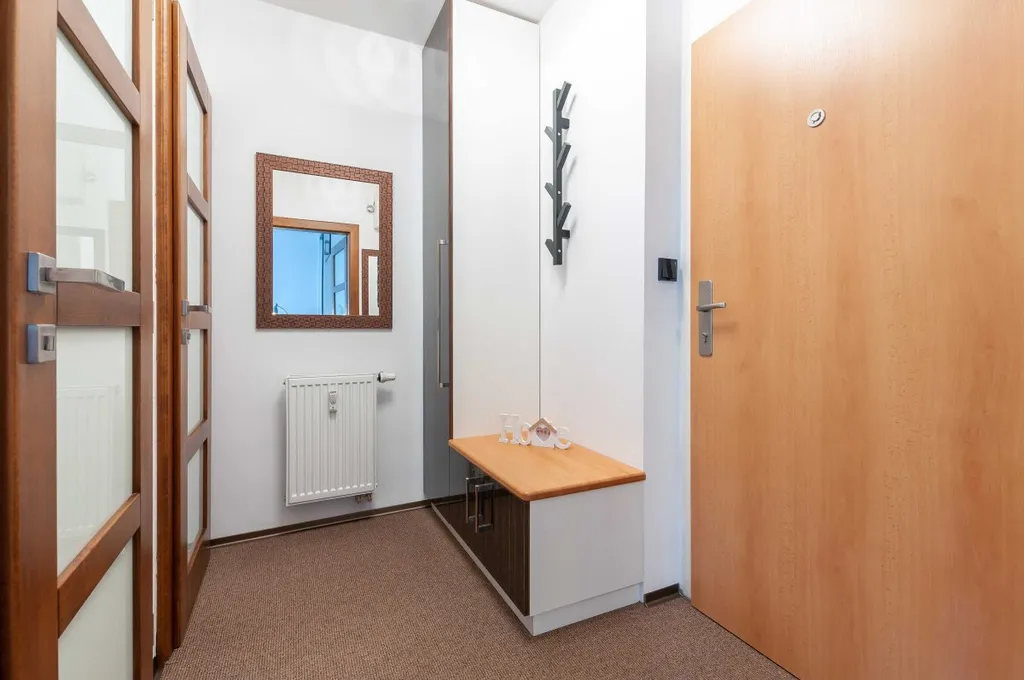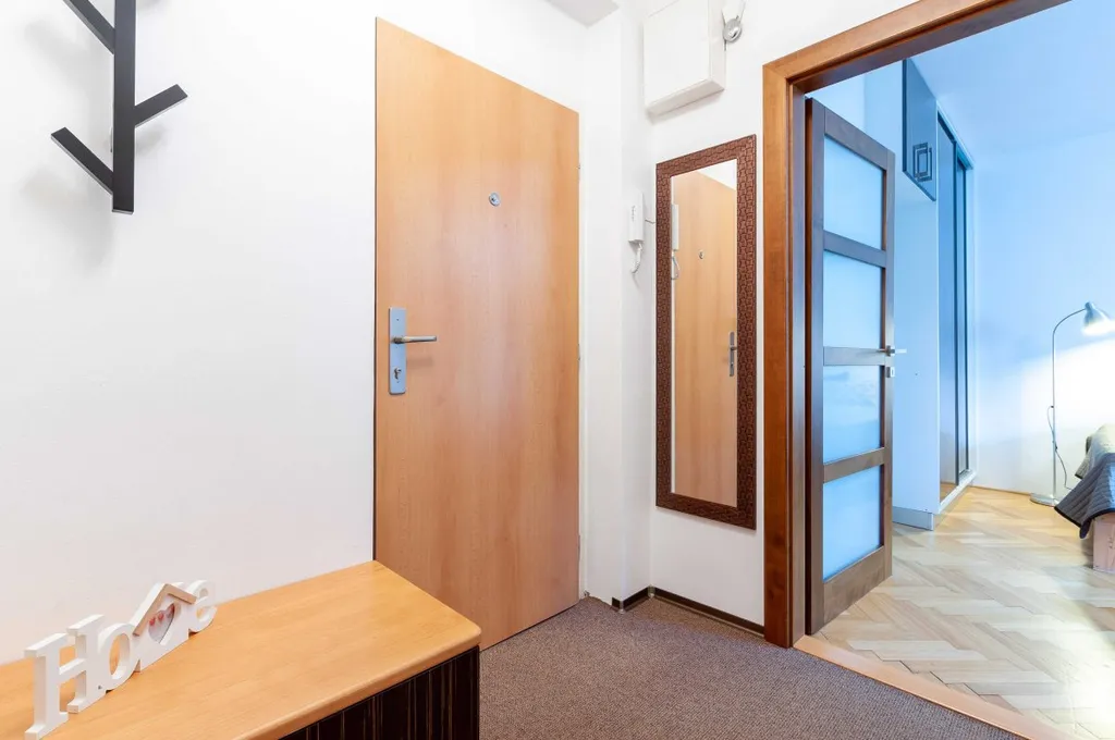 Byt je vybaven přímo k nastěhování. Nová kuchyňská linka disponuje lednicí, myčkou, sklokeramickou deskou a elektrickou troubou. Obývací pokoj je útulně zařízen postelí, jídelním stolem s židlemi, nočním stolkem a šatní skříní. Součástí moderní koupelny je prostorný sprchový kout, umyvadlo se zrcadlem a pračkou. Toaleta je oddělená. Pokoje jsou průchozí.