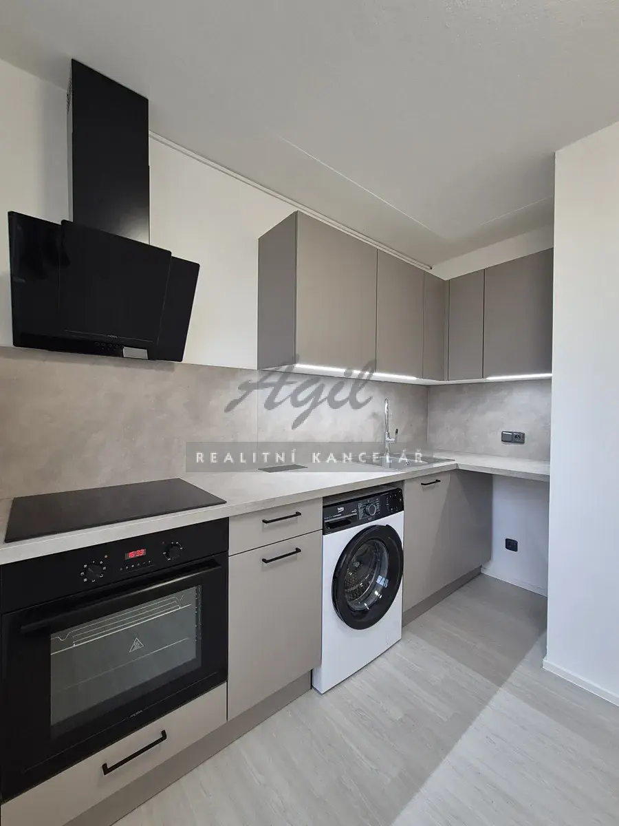 Kuchyň - kuchyňská linka, elektrická indukční deska, vestavná elektrická trouba, digestoř, přípojka na myčku, přípojka na pračku, pračka.