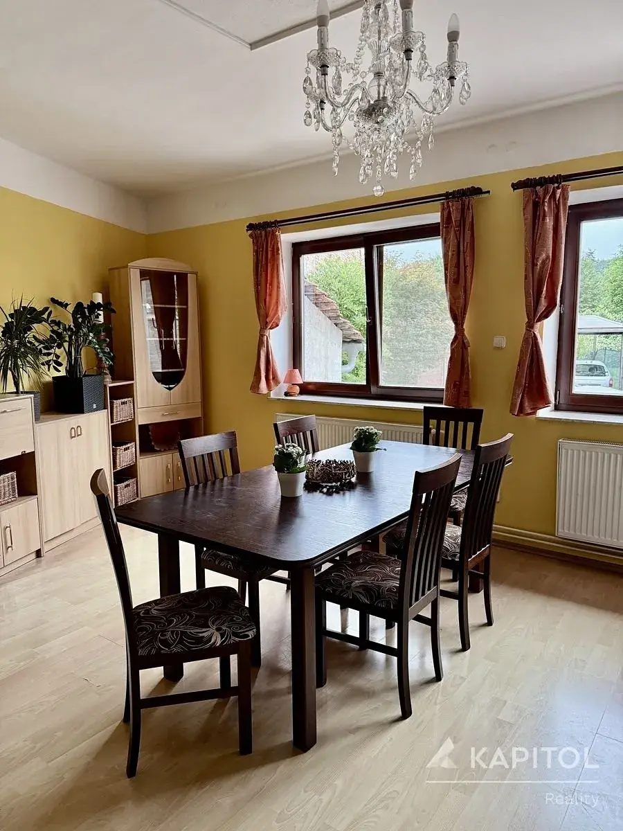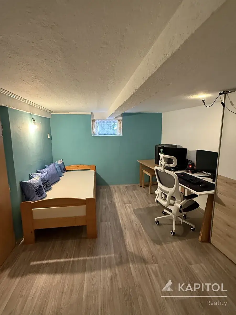 Přízemí tvoří velký obývací pokoj s kuchyňským koutem – srdce domu. Ideální pro společná setkání, vaření i odpočinek. Dále tu najdete dvě prostorné ložnice, útulnou velkou koupelnu, samostatné WC a praktickou spíž. Dům je podsklepený, zde je dále k dispozici obytný pokoj, prádelna a další užitné prostory.