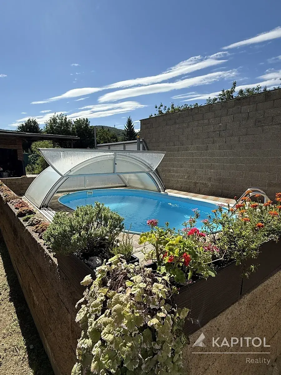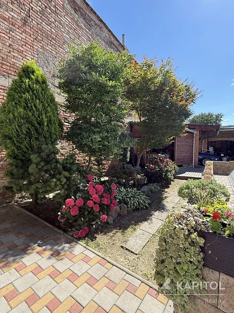 Za domem se rozkládá zahrada o ploše 602 m². V přední části najdete upravenou relaxační zónu s bazénem a altánkem – ideální pro letní dny i večerní posezení. Zadní část je užitná, s ovocnými stromy a prostorem pro pěstování.