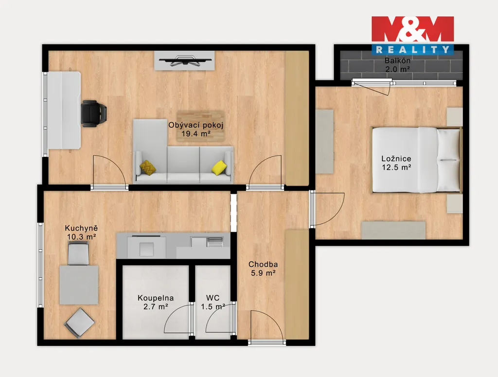 Součástí bytu je balkon o výměře cca 2 m² a sklepní kóje o ploše přes 2 m².
