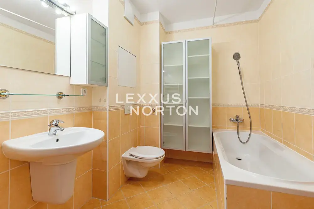 Součástí bytu je kuchyňská linka, koupelna s vanou a dřevěné plovoucí podlahy.