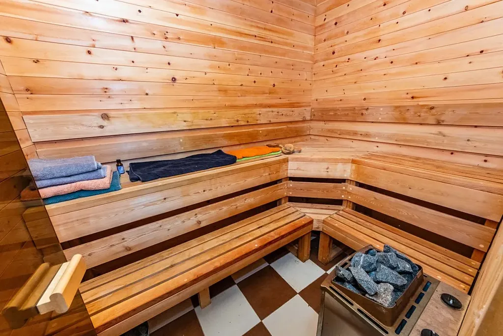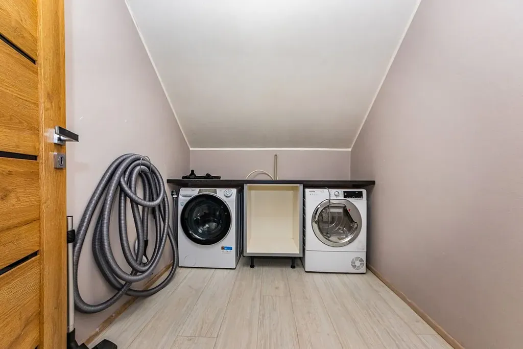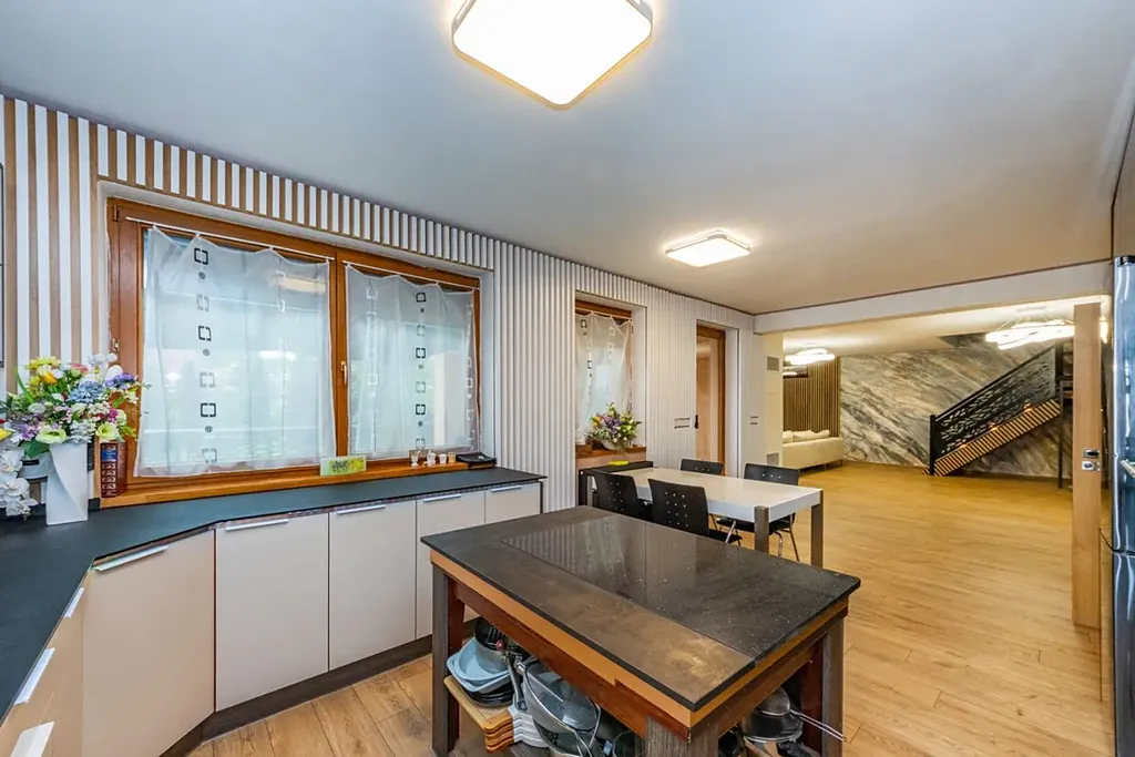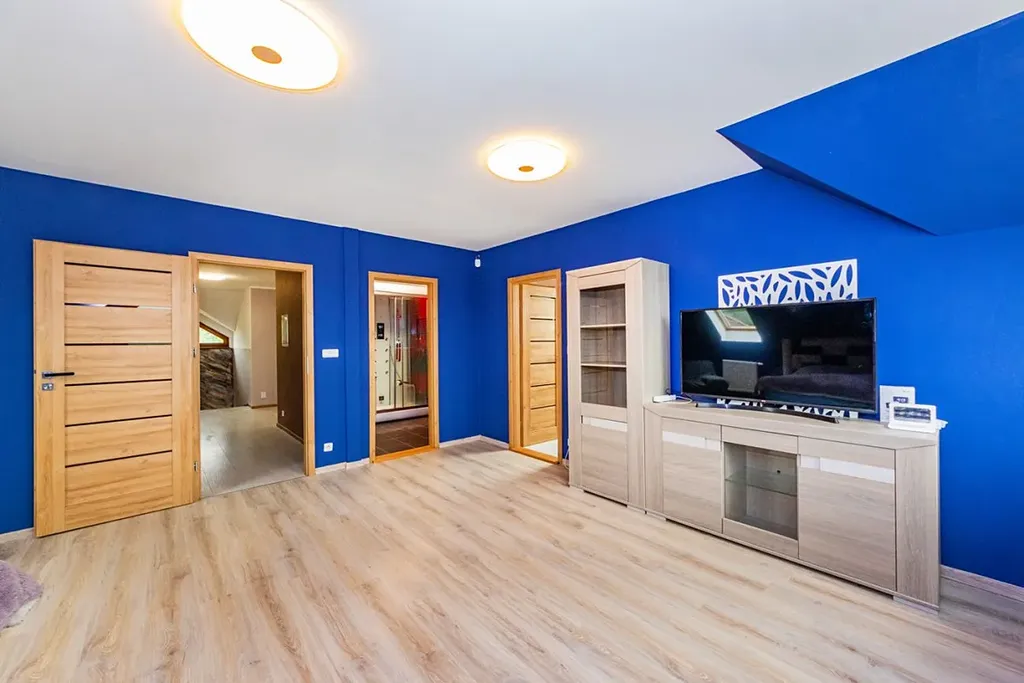 Samostatně stojící dům se dvěma nadzemními podlažími a jedním podzemním podlažím nabízí více než pět pokojů, dvě koupelny, domácí saunu a posilovnu, což zaručuje komfortní bydlení pro každou početnou rodinu.