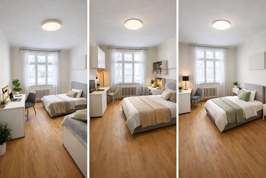 Dispozičně se jedná o 3+1. Díky své velikosti a umístění je byt vhodný jak pro rodinu, tak pro skupinu až pěti studentů.