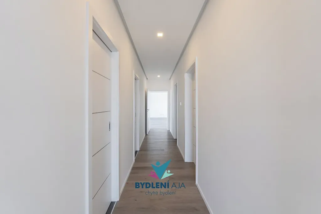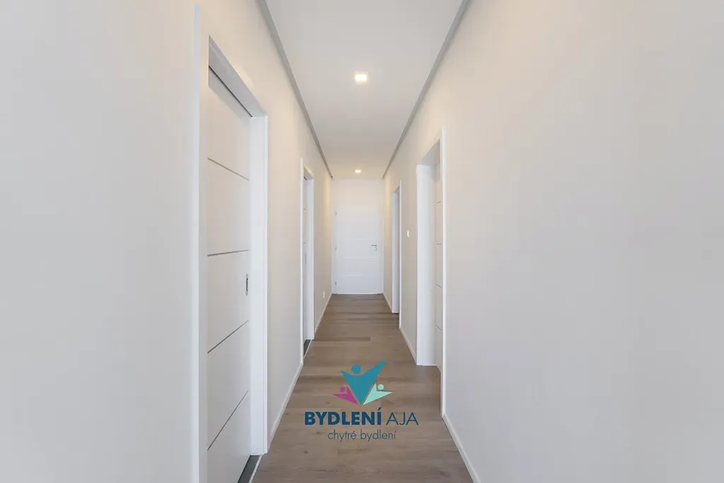 1x ložnice se šatnou a terasou, 2x dětský pokoj, pracovna, kuchyně s obývákem, spižírna, technická místnost, 2 x koupelna, 2x wc, 1x bidet a garáž pro dva velké rodinné vozy, velká terasa z obývacího pokoje.