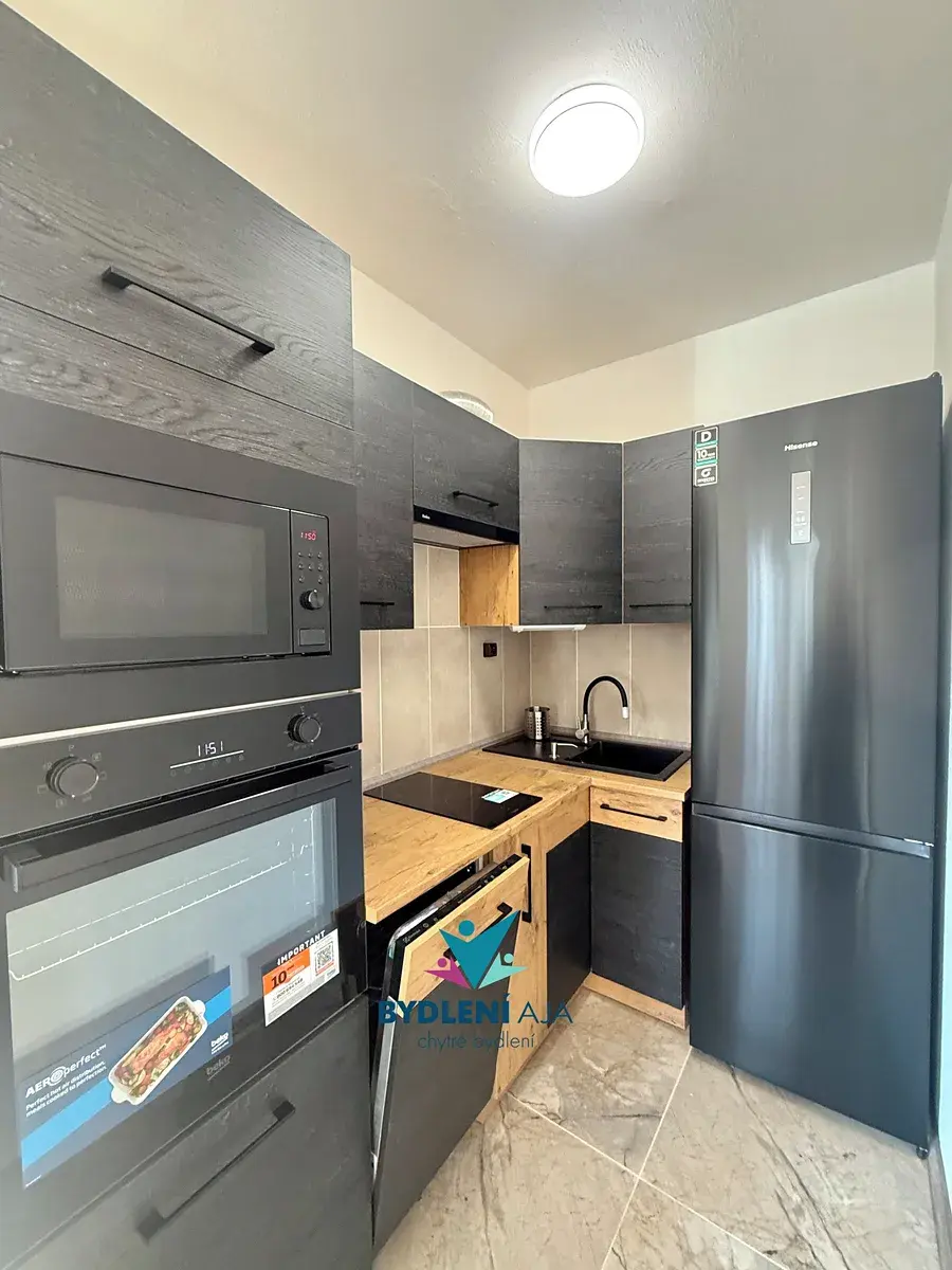 Dominantou bytu je nová nadstandardní kuchyňská linka, vyrobená z kvalitních materiálů a vybavená moderními spotřebiči: