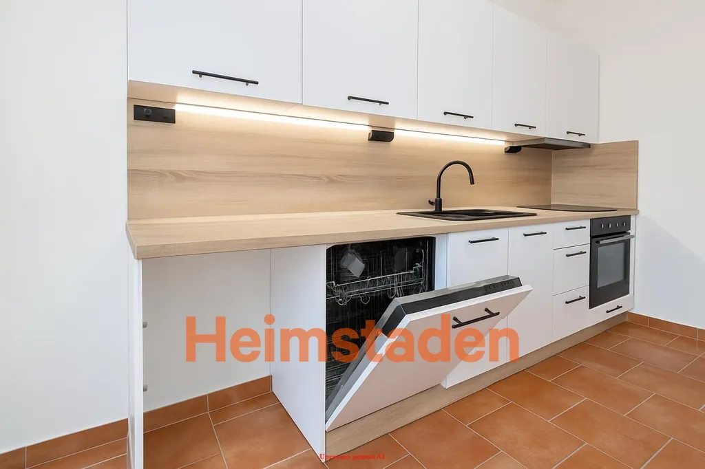 Interiér bytu působí moderně a velmi vkusně. V obytných místnostech jsou položeny kvalitní podlahy v dekoru dřeva, které dodávají prostoru teplo a eleganci. Kuchyně je vybavena moderní kuchyňskou linkou s vestavěnými spotřebiči a myčkou nádobí. Nechybí ani prostor pro automatickou pračku. Dlažba v rezavém odstínu dodává kuchyni osobitý a současný vzhled.