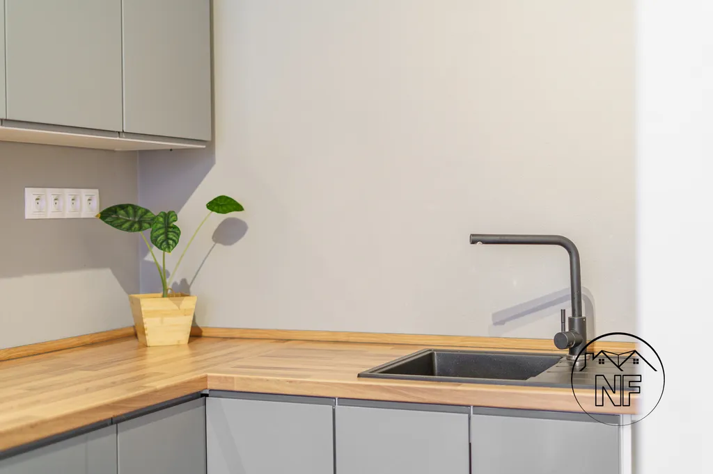 Hlavní obytný prostor nabízí chytré osvětlení, laminátovou plovoucí podlahu a plastová okna s elektricky ovládanými roletami. Moderní kuchyňská linka je vybavena vestavěnými spotřebiči včetně myčky. Součástí prodeje je i lednice.