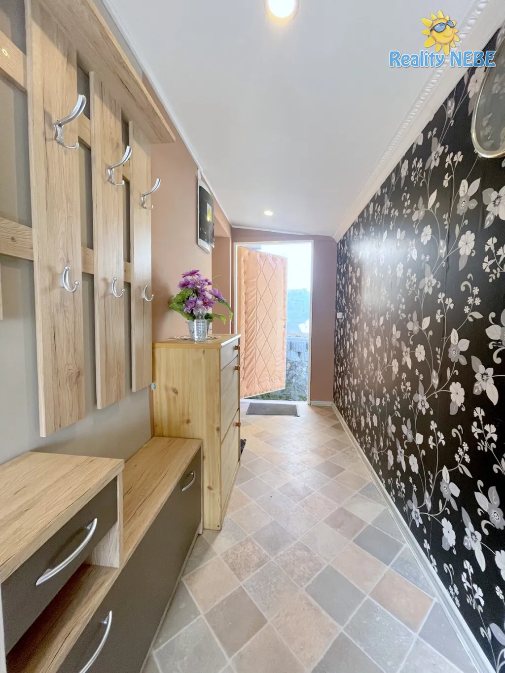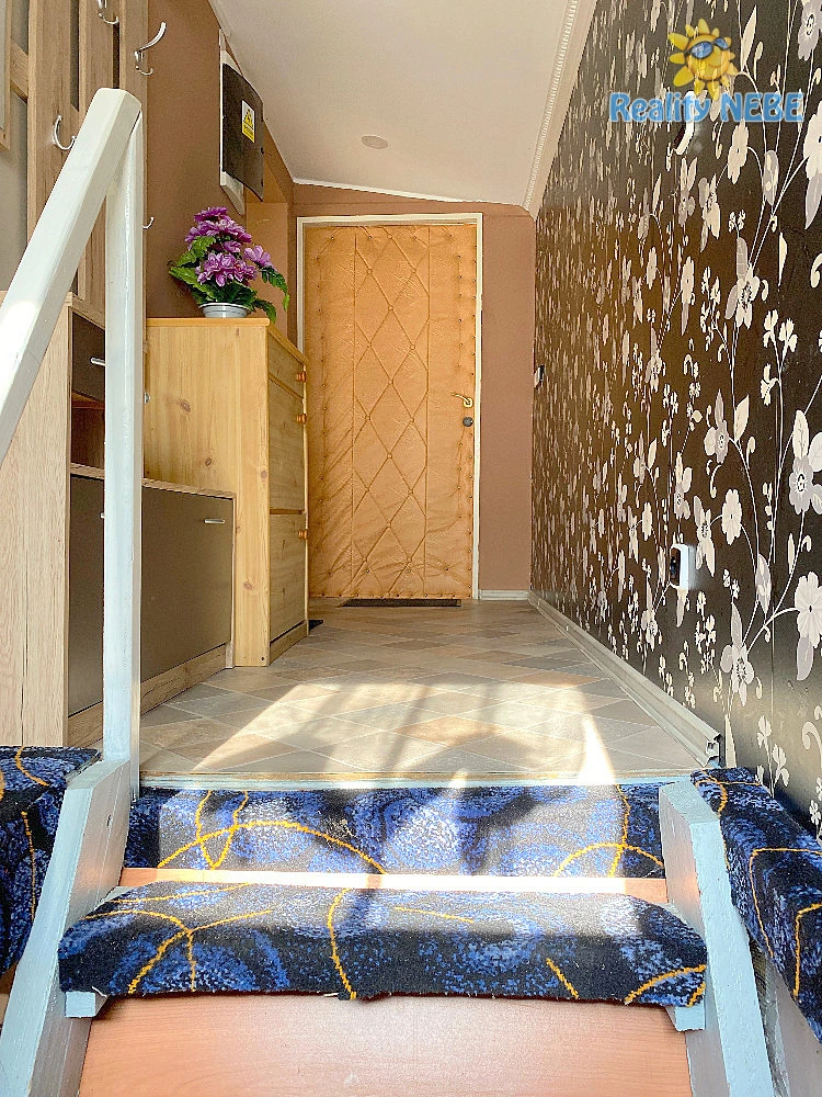Přízemí – předsíň, obývací pokoj se zařízenou kuchyní s myčkou., lednicí, velká terasa a menší pokoj cca 4 m² (celkem cca 30 m²)