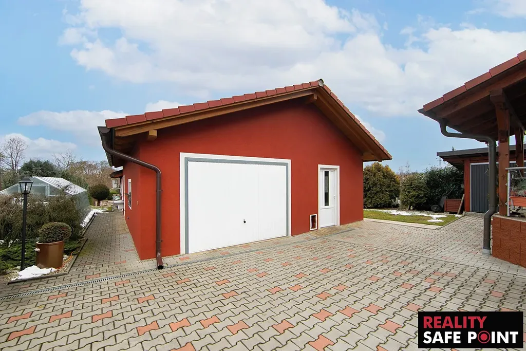 - samostatně stojící garáž (31 m²) – se vstupními vraty z přední části pozemku; garáž je dveřmi propojena se skladovou částí.