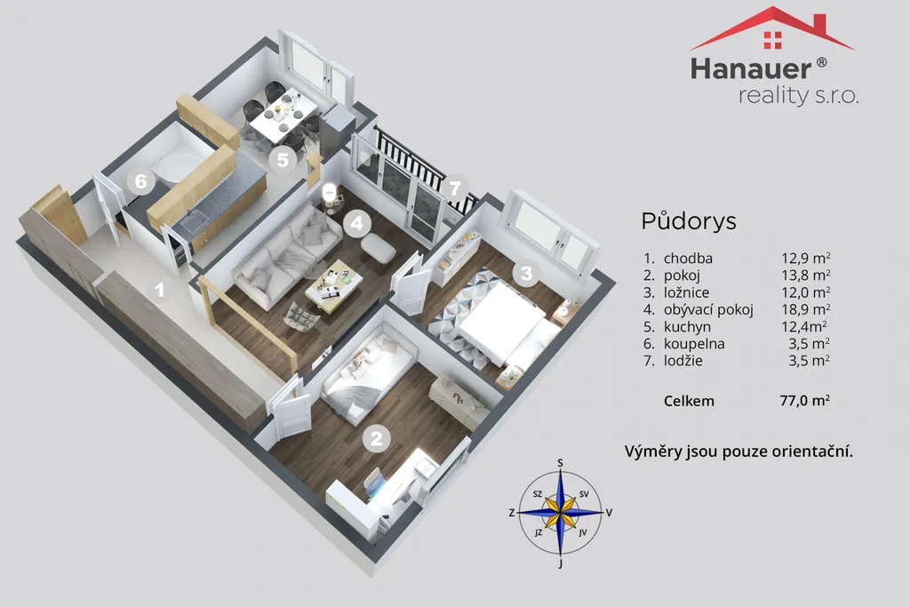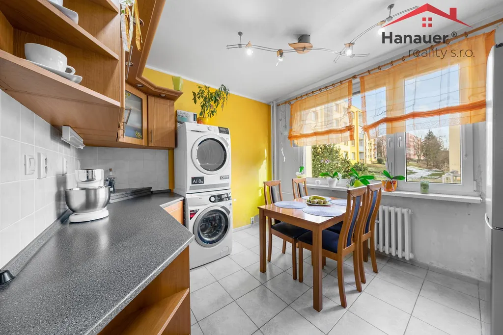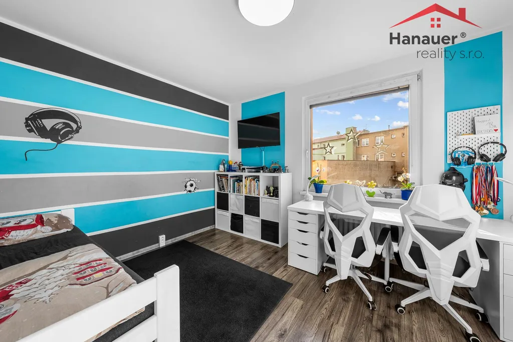 Dispozičně je byt řešen jako 3+1 a nabízí prostornou vstupní chodbu s vestavěnými skříněmi, moderní obývací pokoj, ložnici, dětský pokoj a koupelnu s WC. Příjemným benefitem je lodžie. K bytu náleží také sklepní kóje.