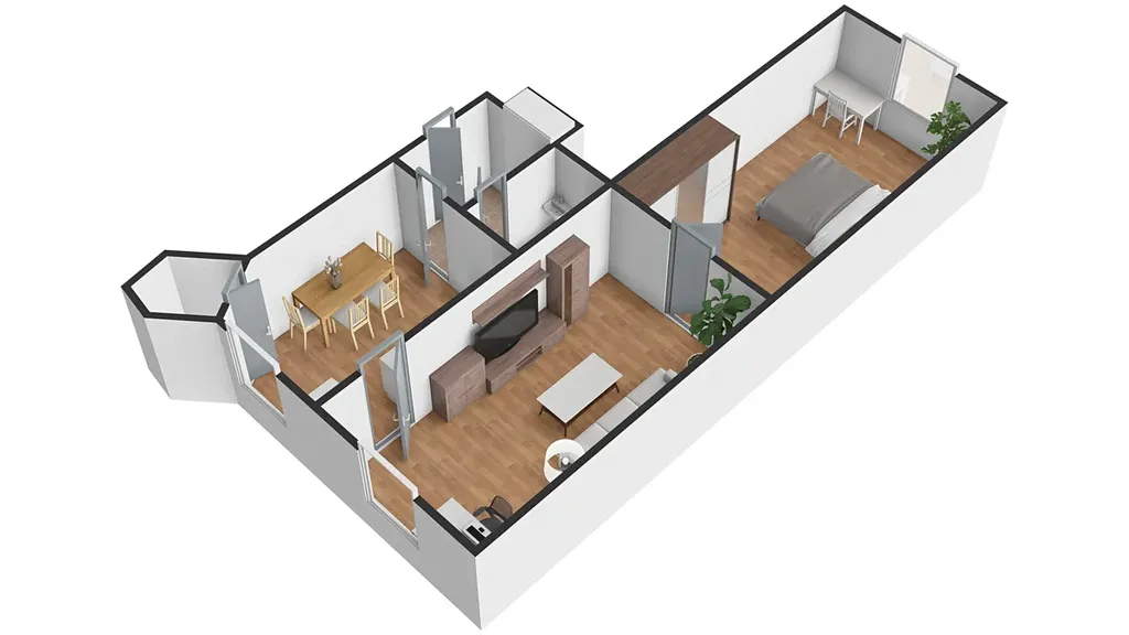 Byt je umístěn v 1. patře zděného domu. Dispozice je 2+1, užitná plocha bytu činí 53,6 m². Byt tvoří předsíň, kuchyně, obývací pokoj, ložnice, koupelna a samostatné WC. Vytápění je zajištěno plynovými kamny. Okna z kuchyně a obývacího pokoje jsou orientována na jih do společné zahrady, okna z ložnice na sever do ulice.