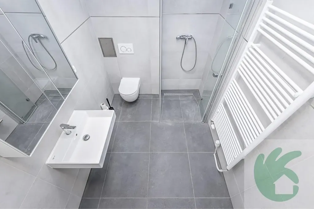 Po vstupu do bytu se ocitneme v prostorné chodbě s praktickou skříní pro uložení věcí. Z chodby vstoupíme do moderní koupelny, která nabízí prostorný sprchový kout, umyvadlo se skříňkou a zrcadlem, toaletu i žebříkové topení pro příjemný komfort.