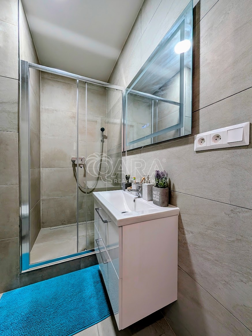 Dispozice bytu je řešena jako obytný prostor s kuchyňským koutem a koupelnou. Kuchyňská linka s vestavěnými spotřebiči (horkovzdušná trouba, el. varná deska, digestoř, myčka, a lednice s mrazákem) navazuje na obytnou část, kde je dostatek místa pro denní i noční zónu. Koupelna je vybavena sprchovým koutem a toaletou, umyvadlem a nemlžícím se zrcadlem ukazatelem teploty a dalších informací. Je zde i přípojka a prostor na pračku.