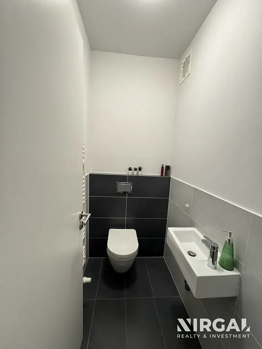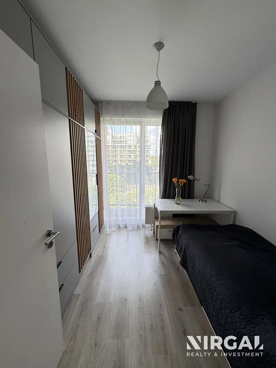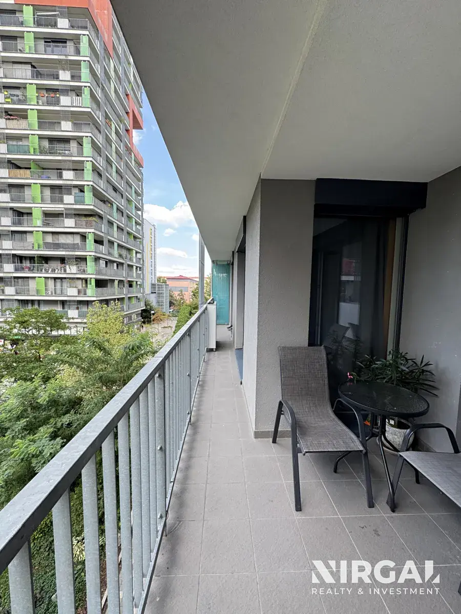 Byt se nachází ve 3. patře a tvoří ho 3 neprůchozí místnosti: světlý obývací pokoj s kuchyňským koutem a 2 útulné ložnice. Všechny pokoje mají velká francouzská okna a vstup na terasu (21 m2). Prostorná koupelna s vanou má dostatek místa i na skříňky a pračkou. Toaleta je samostatná, s vlastním umyvadlem. Kuchyňská linka je vybavená ledničkou s mrazákem, sklokeramickou varnou deskou, mikrovlnnou troubou, digestoří, troubou a myčkou.