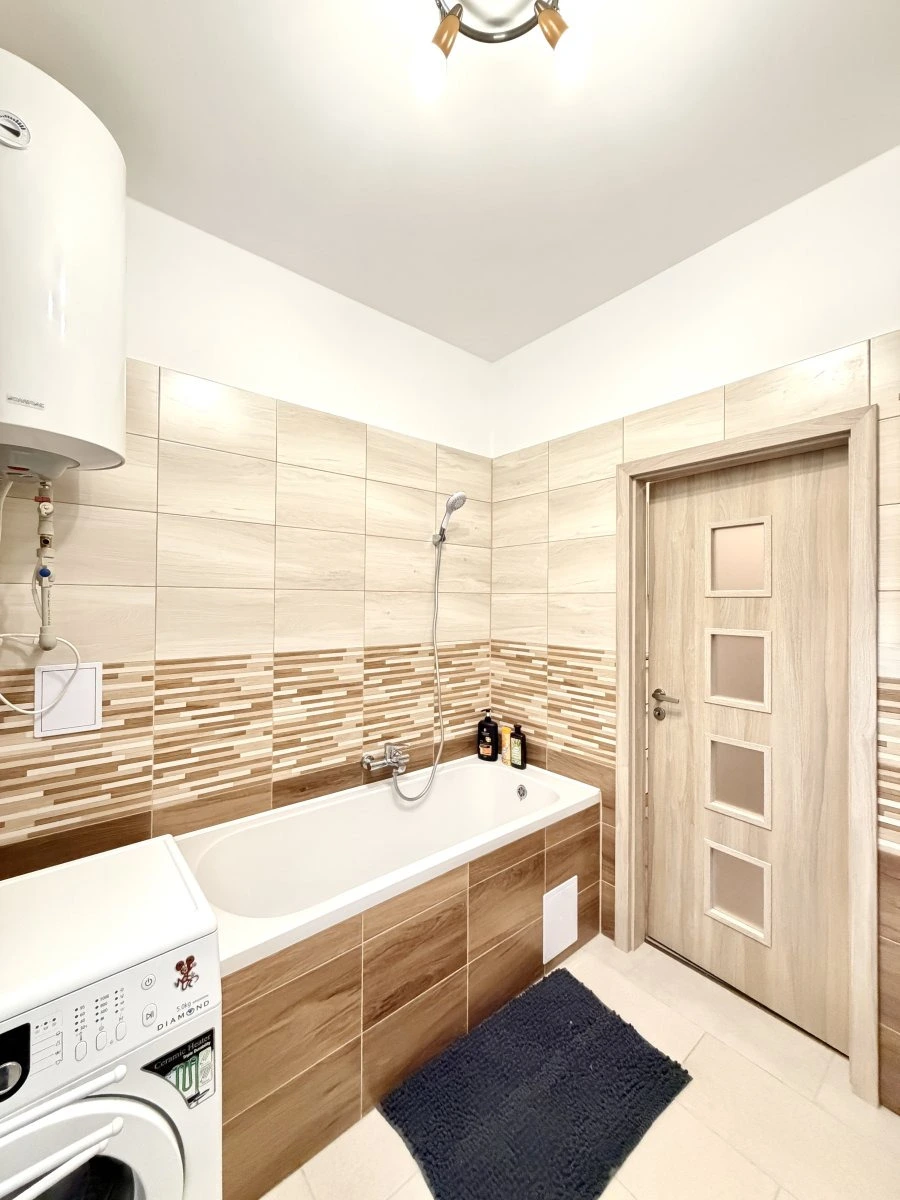 Byt se nabízí částečně vybavený. Kuchyně disponuje myčkou, elektrickou troubou, varnou deskou, mikrovlnnou troubou a digestoří. Obývací část je zařízena pohovkou, konferenčním stolem a komodami. Součástí ložnice je velká šatní skříň a pohovka. V druhém pokoji najdeme komodu a dvě šatní skříně. V koupelně je vana, umyvadlo, toaleta, pračka a skříňky.