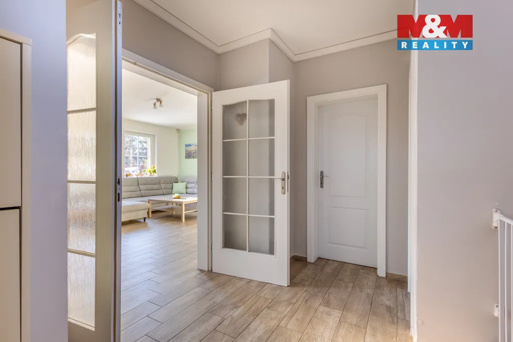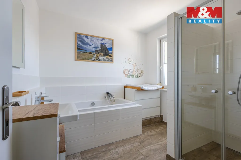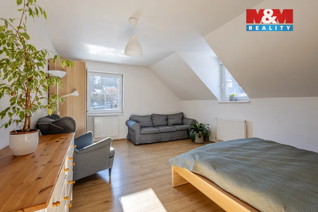 Prodej rodinného domu 5+kk v klidné části obce Slunečná, 9 km od České Lípy. Dispozice domu se rozkládá ve dvou nadzemních podlaží a nedílnou součástí je celkově oplocená okrasná zahrada, navržená architektem, s výměrou 1689 m². Dům je velmi prostorný. Obývací pokoj s kuchyní, hala, chodba, koupelna (sprch. kout + vana), samostatné WC, prádelna, technická místnost, tvoří první nadzemní podlaží. V druhém nadzemním podlaží jsou 3 pokoje, koupelna se sprchovým koutem a bidetem, pracovna a vstup na pochozí půdu. Vytápění a ohřev vody tepelným čerpadlem (podlahové topení + radiátory), další zdroj doplňují solární panely s baterií o výkonu 10 kWh. To vše tvoří nízké provozní náklady. Zahrada se může pochlubit vjezdem s elektrobránou na dálkové ovládání, krytým stáním na dvě auta s elektronabíjecí stanicí, finskou saunou, zahradním domkem, krytou terasou se vstupem přímo z domu, pergolou, bazénem a skleníkem. Dům je vybaven venkovními roletami a krásným výhledem do krajiny. Více info v RK.