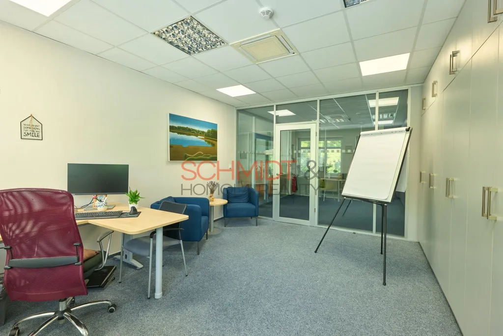 Nabízíme k pronájmu moderní a plně vybavený kancelářský prostor o rozměrech 20,26 m² situovaný ve druhém nadzemním podlaží administrativní budovy na adrese Herbenova 869/42 Hustopeče. Ke kanceláři lze využívat společný prostor vybavený barem, zasedací místností, archívem, šatnou, serverovnu a toaletami. Součástí pronájmu je vybavení viditelné na fotografiích, dále jedno parkovací místo. Prostory jsou přístupné z centrálního schodiště či z výtahu. Budova i vybavení - vše je v pečlivě udržovaném stavu, a je součástí uzavřeného areálu. Prostory jsou chráněny zabezpečovacím systémem a systémem požární signalizace. O venkovní prostory se stará bezpečnostní agentura. V patře se nachází vícero samostatných kanceláří, energie se budou rozpočítávat podle m². Vodné a stočné je zahrnuto v nájmu.