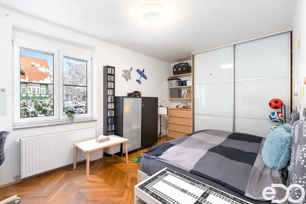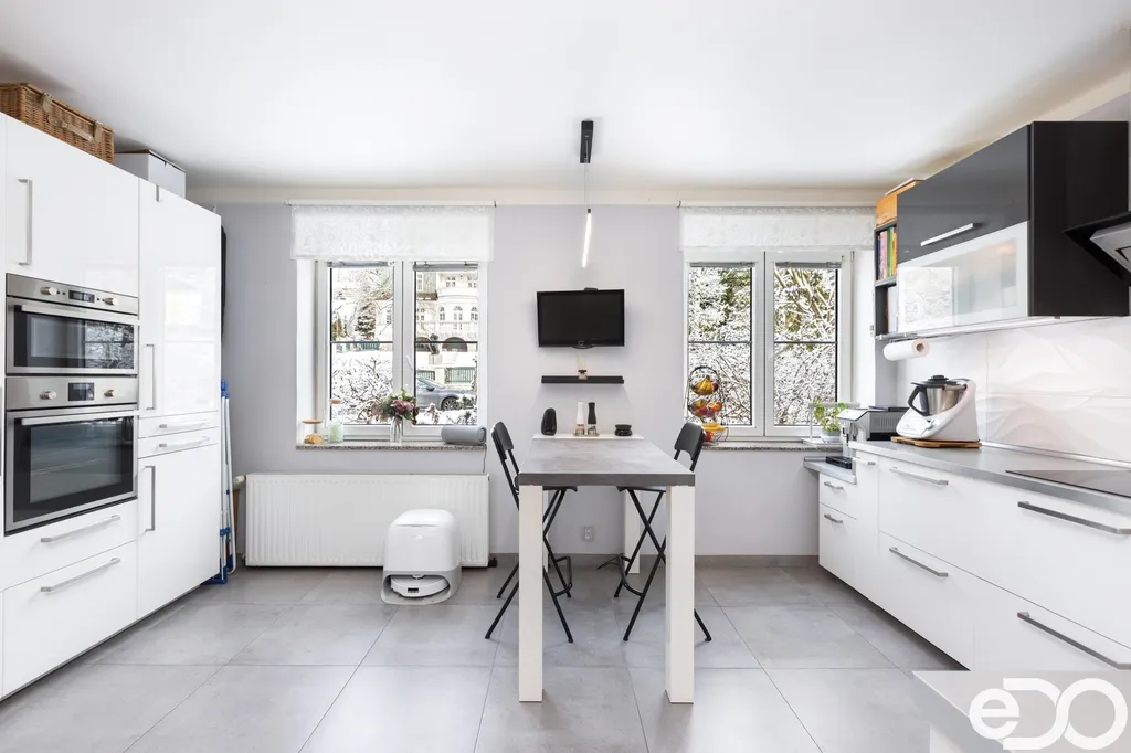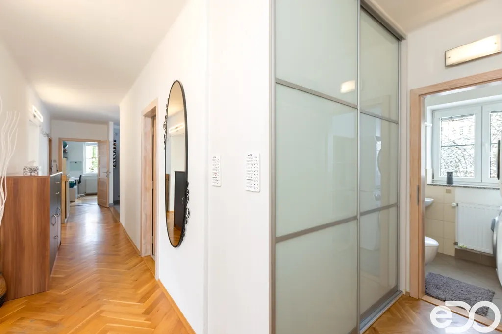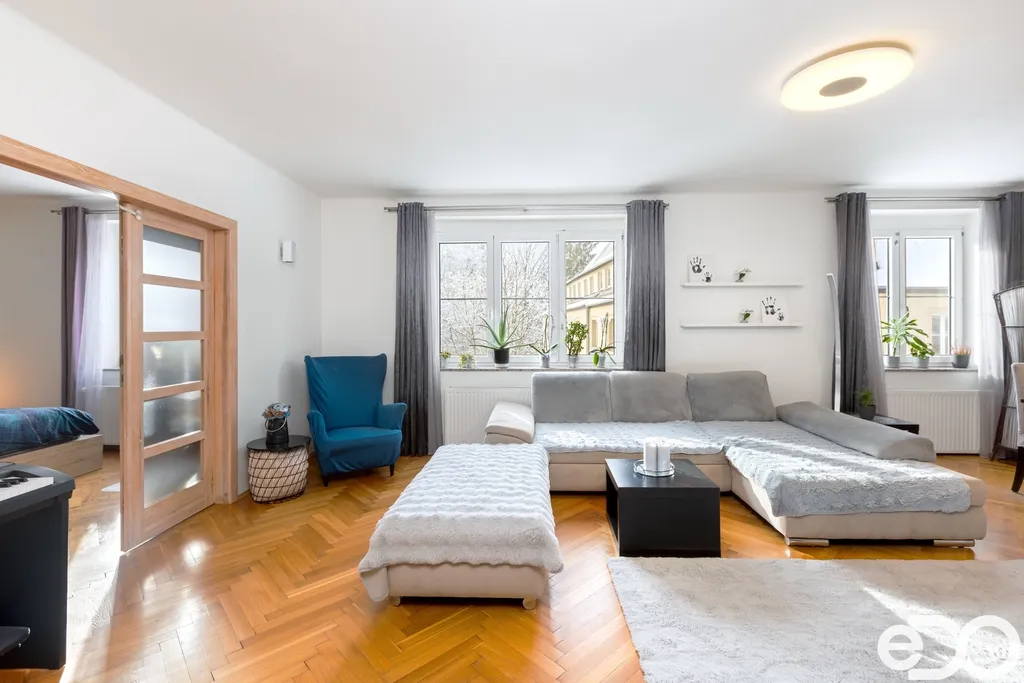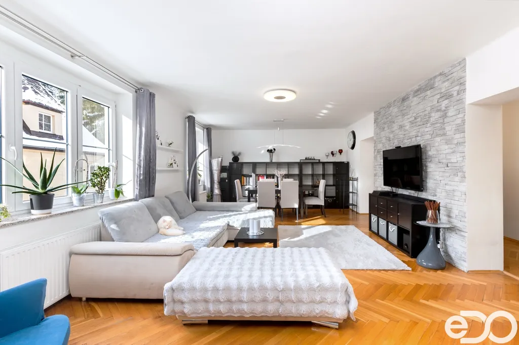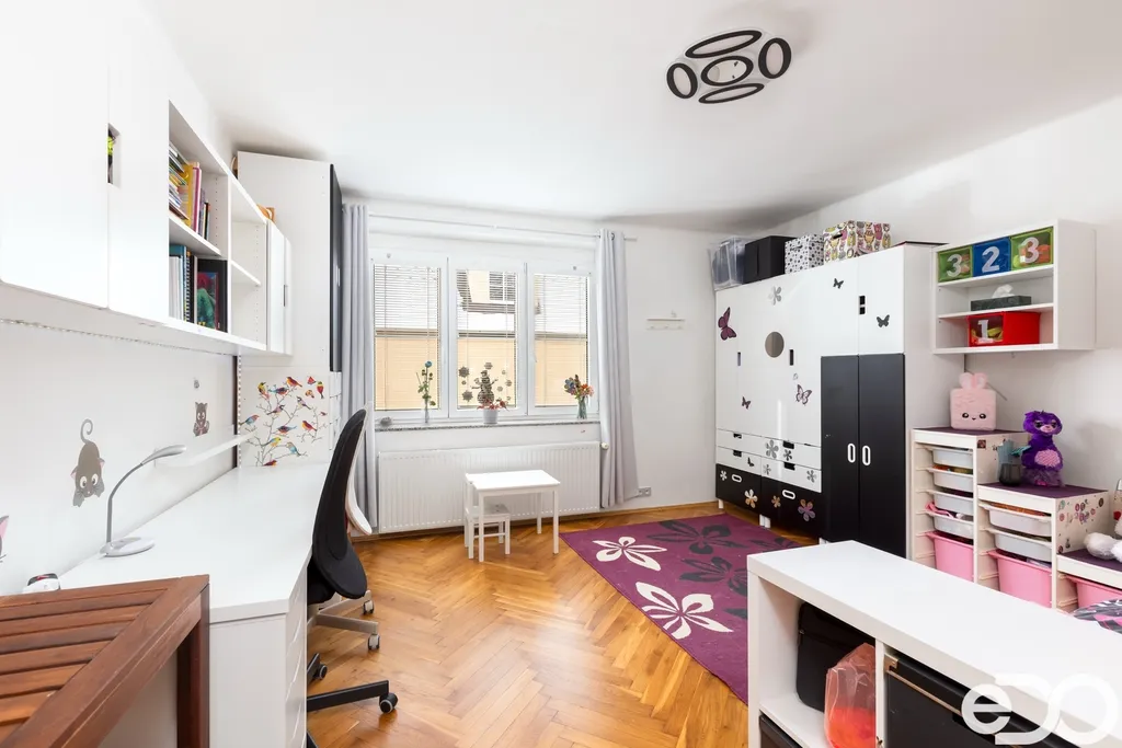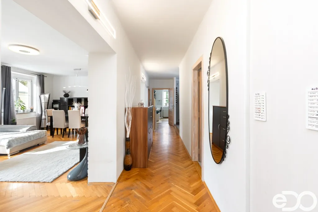 Samotný byt o dispozici 4+1 a podlahové ploše 135 m² se nachází ve druhém nadzemním podlaží čtyřpodlažního zděného domu. Dispozice je klasická, přehledná a funkční. Kuchyň orientovaná na sever poskytuje klidné pracovní zázemí, zatímco obývací pokoj, ložnice i dětský pokoj směřují na jih a jsou po většinu dne zalité sluncem. Velkorysá plocha jednotlivých místností umožňuje pohodlné rodinné bydlení i reprezentativní využití prostoru.