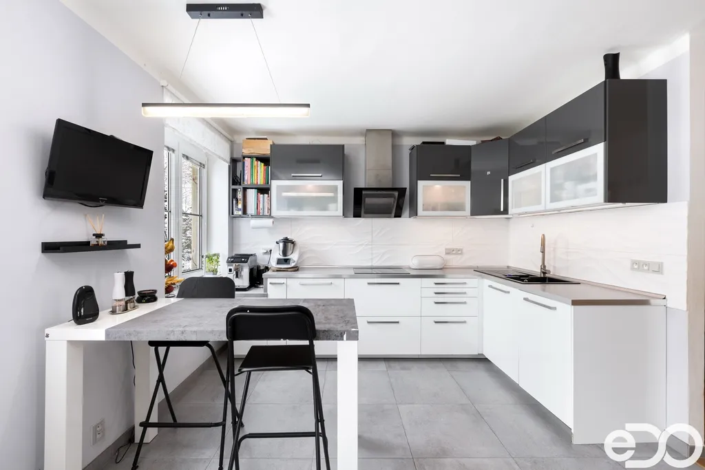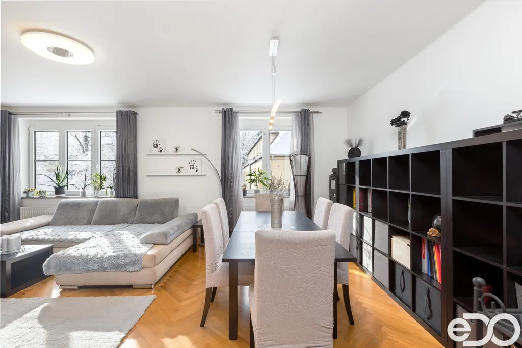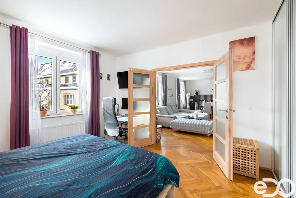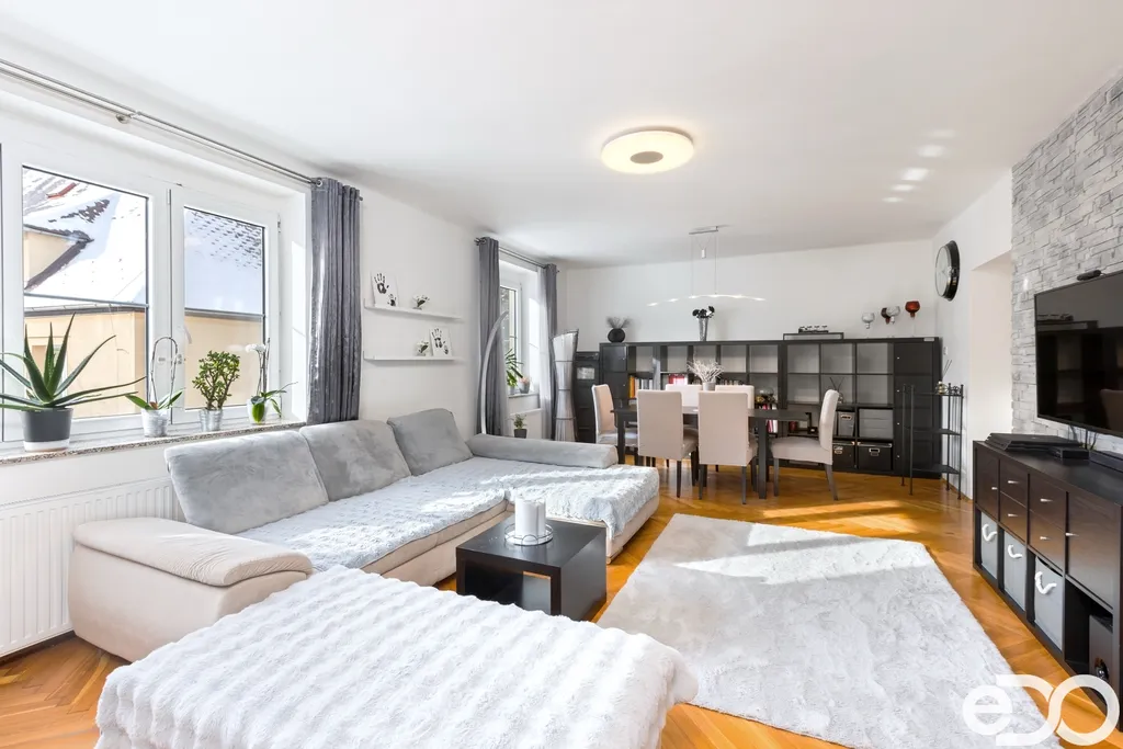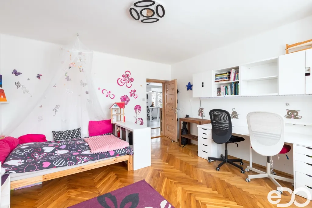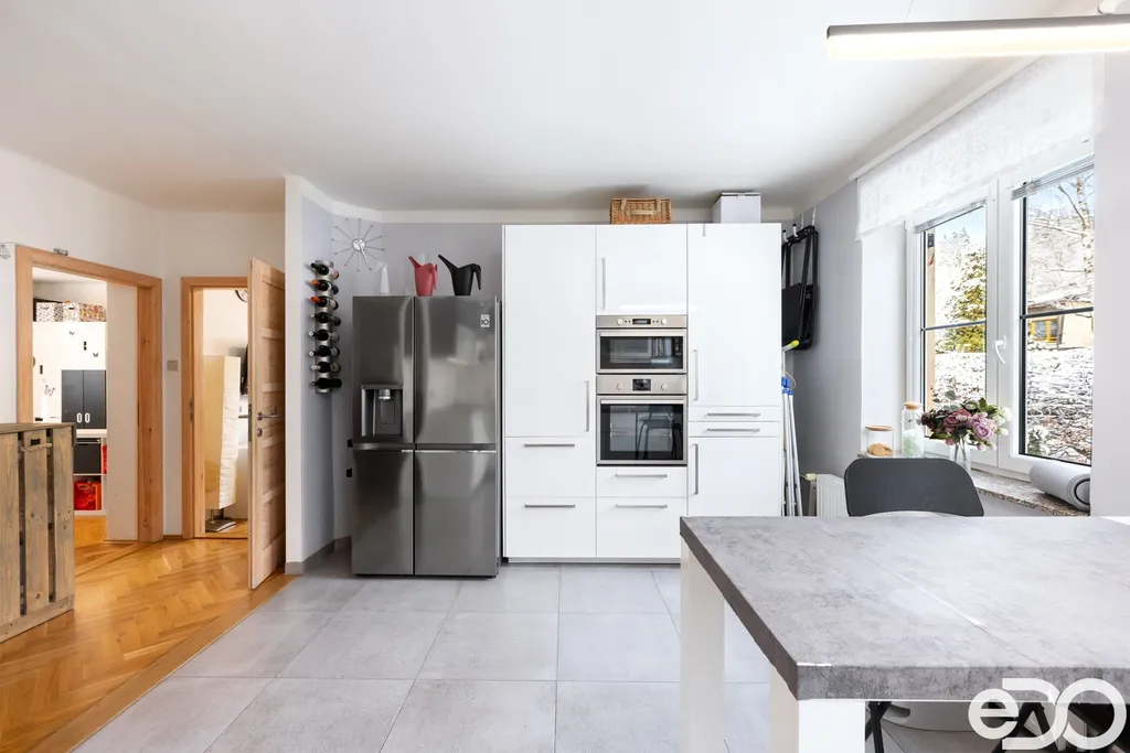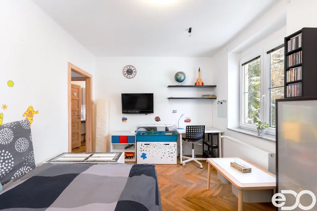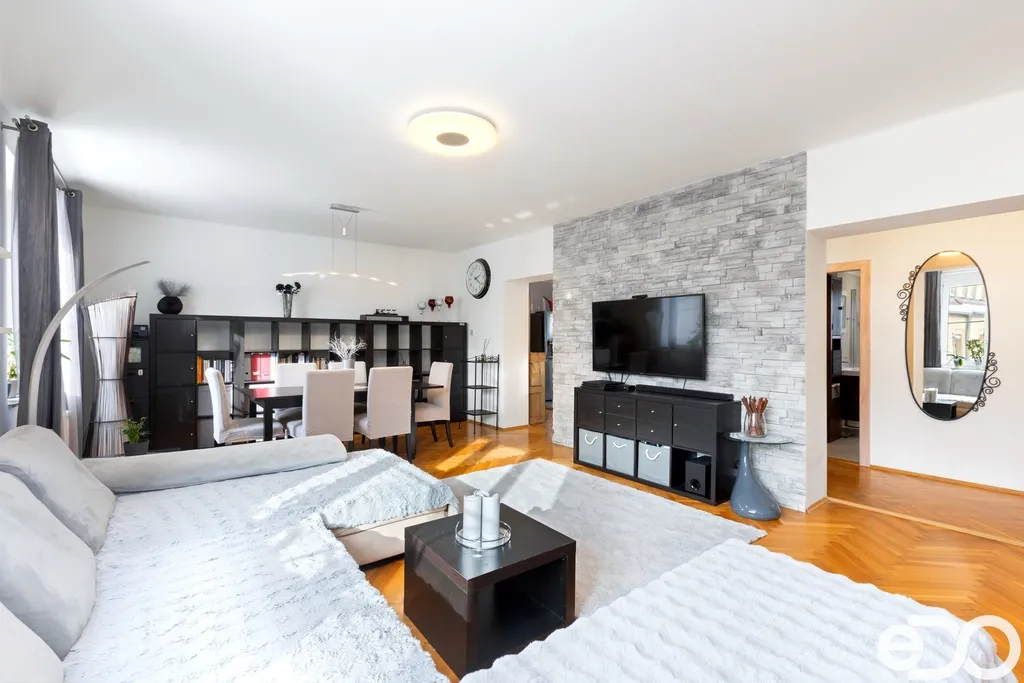 Samotný byt o dispozici 4+1 a podlahové ploše 135 m² se nachází ve druhém nadzemním podlaží čtyřpodlažního zděného domu. Dispozice je klasická, přehledná a funkční. Kuchyň orientovaná na sever poskytuje klidné pracovní zázemí, zatímco obývací pokoj, ložnice i dětský pokoj směřují na jih a jsou po většinu dne zalité sluncem. Velkorysá plocha jednotlivých místností umožňuje pohodlné rodinné bydlení i reprezentativní využití prostoru.