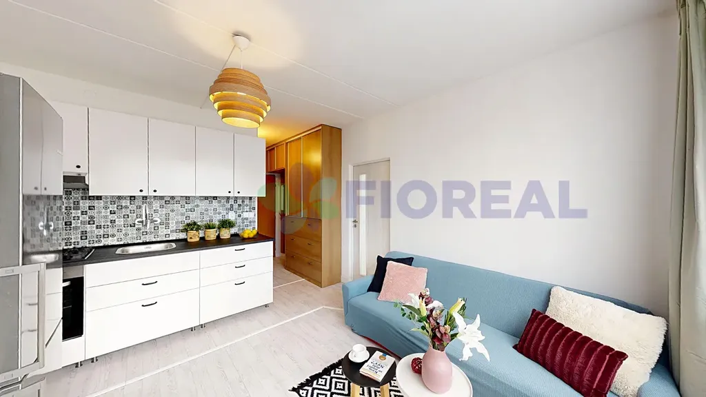 Hlavní komunikační prostor tvoří místnost, kde se nachází obývací část s pohovkou a skříňkami pod TV, a dále kuchyňská část, kde najdete novou kuchyňskou linku s el. troubou, plynovou varnou deskou, digestoří a lednicí s mrazákem.