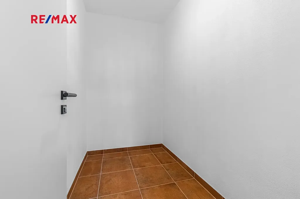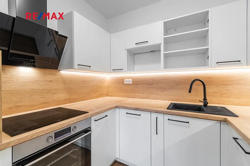Kuchyně je vybavena vestavěnými spotřebiči: varná indukční deska, trouba, digestoř, myčka na nádobí a kombinovaná lednice s mrazákem. V bytě se nachází komora a hned vedle bytu prostorný sklep. Součástí pronájmu je také vnitřní parkovací stání.