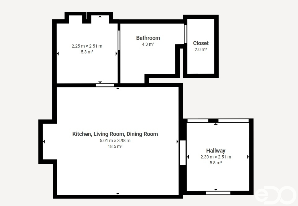 1+kk – obytný prostor s kuchyňskou částí, koupelna a menší samostatná místnost s oknem, kterou lze využít jako šatnu, pracovnu nebo i pro občasné přespání