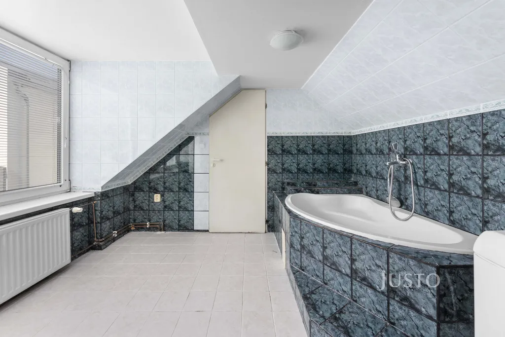 - ve velmi prostorné koupelně je dvojumyvadlo se skříňkou, rohová vana, automatická pračka, samostatná koupelnová skříňka.