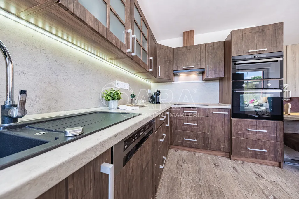 Do domu se vchází bývalým průjezdem, ze kterého je nyní uděláno prostorné garážové stání, takže pěkně suchou nožkou z domu do auta. Vjezd je opatřen novými elektrickými garážovými vraty se samostatným vstupem "pro pěší". Je zde umístěný Wallbox - nabíjecí stanice pro dvě elektroauta. Z průjezdu se vchází do přízemí domu nebo rovnou na zahradu. V přízemí je situován samostatný byt 1+kk, který je možno využít jako kancelář či máte-li odrostlejšího potomka a chce se cítit tak trochu samostatně, i zde je tato možnost, nebo pronájem. Byt je vybaven plně funkční kuchyňskou linkou, velkou a pohodlnou manželskou postelí s nočními stolky, komodou a TV, jídelním stolem a velkorysou šatní skříní na míru, prostornou koupelnou se sprchovým koutem a toaletou.