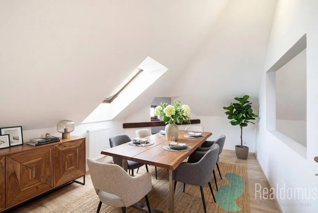 Podkrovní bytová jednotka prošla rozsáhlou rekonstrukcí, díky které nabízí moderní, světlé a velmi příjemné bydlení bez nutnosti dalších investic. Dispozice zahrnuje obývací pokoj s kuchyňským koutem, samostatnou ložnici, koupelnu se sprchovým koutem a praktickou předsíň s úložnými možnostmi.