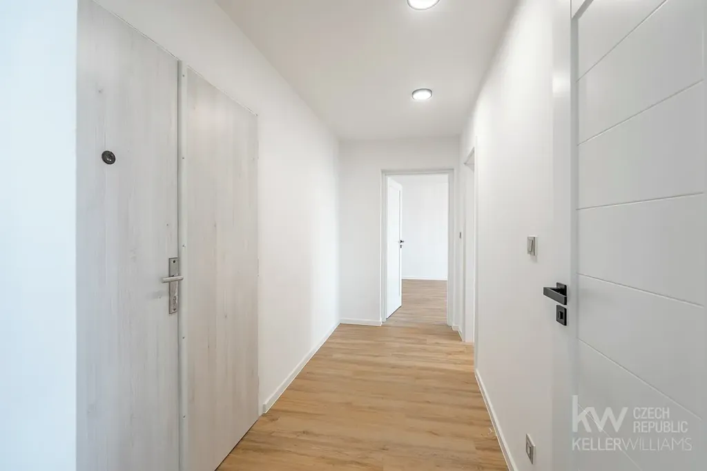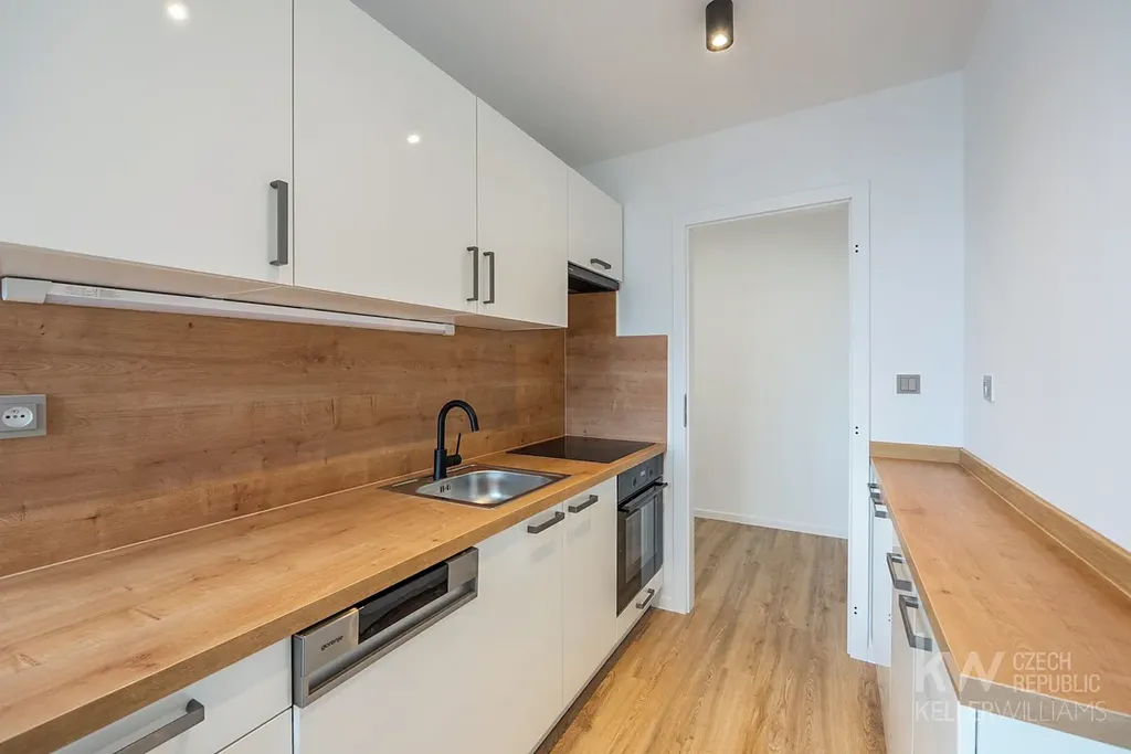 V bytě jsou nové rozvody elektřiny, vody i odpadu, nové podlahy, interiérové dveře, kompletně nová kuchyňská linka včetně vestavných spotřebičů a nová koupelna.