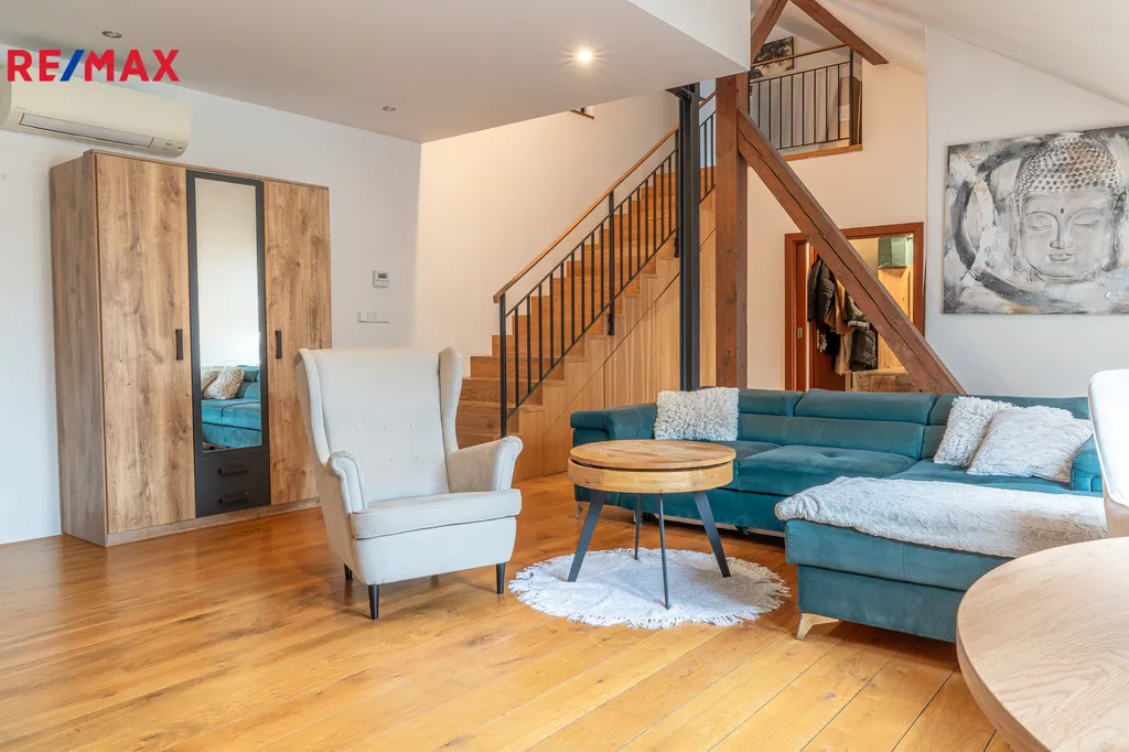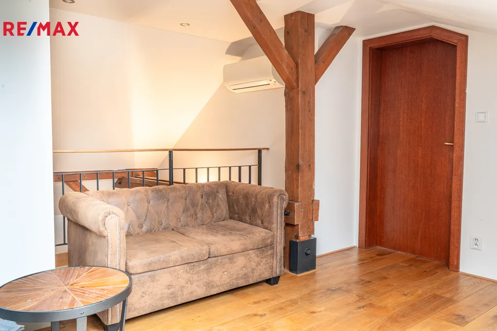 Po schodišti se dostanete do horního patra, kde se nachází pracovna (či ložnice) a další samostatná ložnice. Z této úrovně bytu se otevírají nádherné výhledy na Pražský hrad, Mánes i řeku Vltava. Byt je vybaven třemi klimatizačními jednotkami, dřevěnými podlahami a praktickými úložnými prostory. Dům si zachovává historický ráz a je vybaven výtahem.