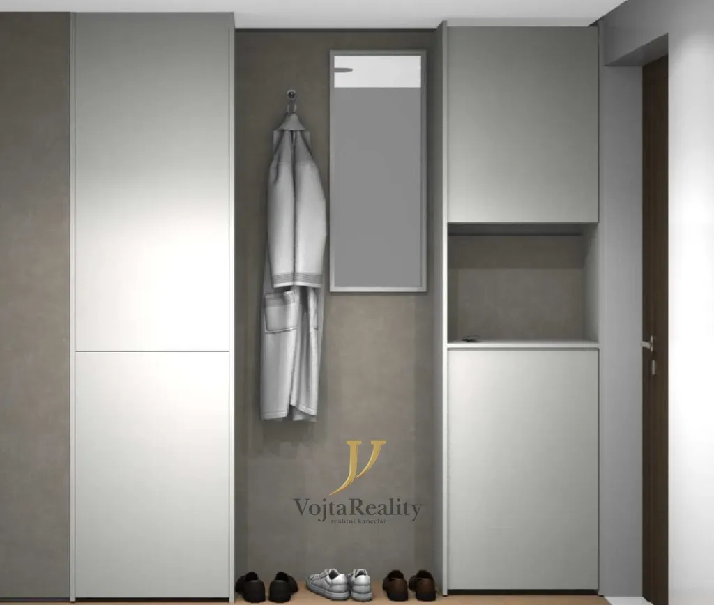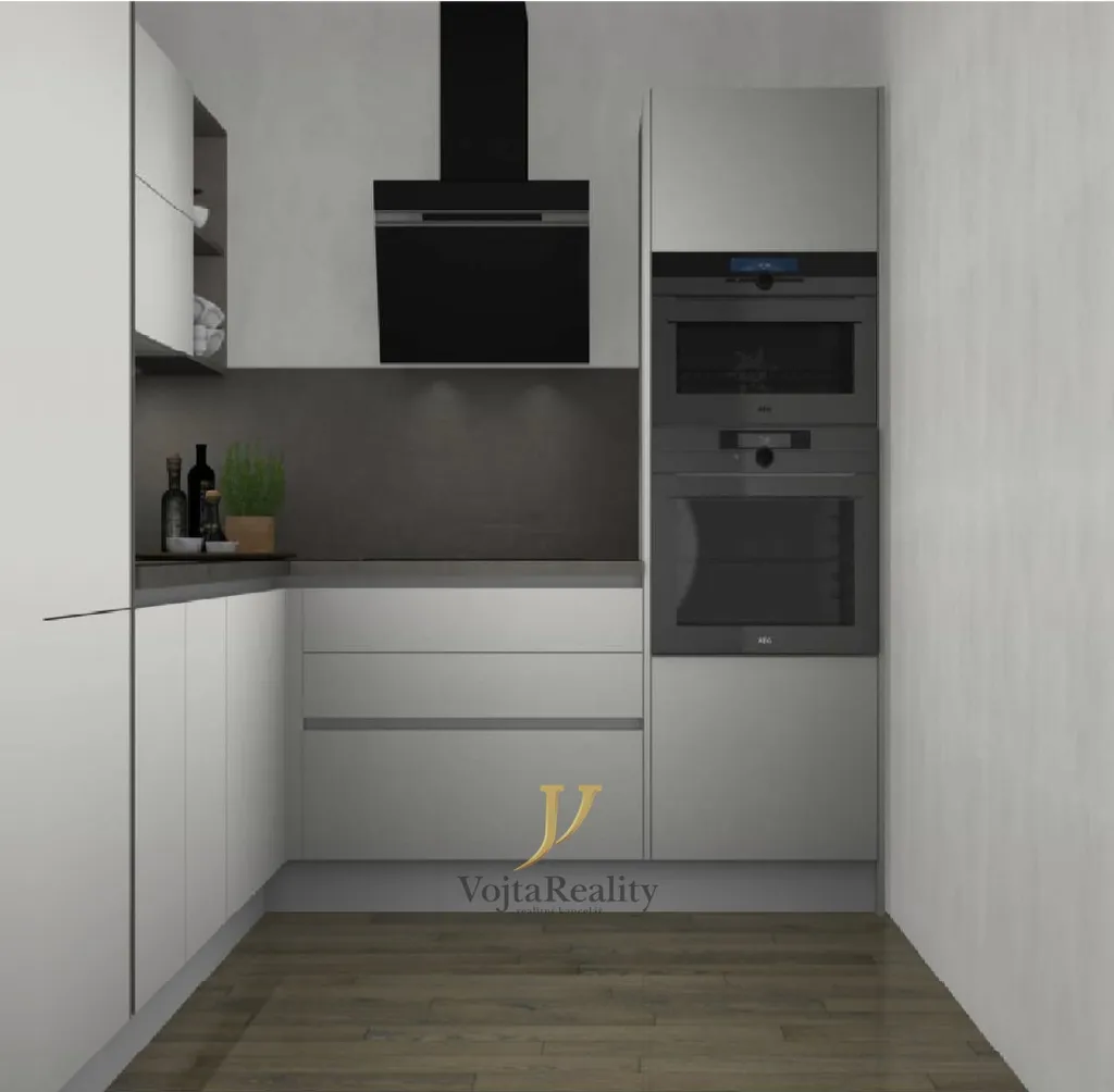 Byt bude vybaven komplexní kuchyní renomované značky STOSA včetně spotřebičů a chladničky. Obývací zóna nevybavená.