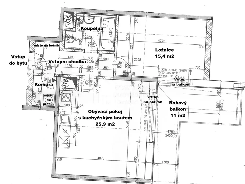 Byt je situován v nejvyšším, 6. patře cihlové novostavby s výtahem. Obývací pokoj s kuchyňským koutem má orientaci na jih, ložnice pak na západ. Z obou pokojů je možné vstoupit na rohový balkon.