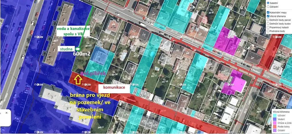 Na pozemku je vlastní studna. Kupující si na vlastní náklady přivede na pozemek vodu a kanalizaci, kdy věcným břemenem povede z ulice Ve Stezkách nebo z ulice Radiomechaniků. Projektová dokumentace k nahlédnutí. Elektřina již na pozemku.