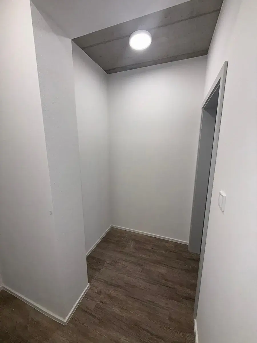 Dispozice bytu zahrnuje vstupní chodbu, prostorný obývací pokoj s kuchyňským koutem a koupelnu s toaletou.