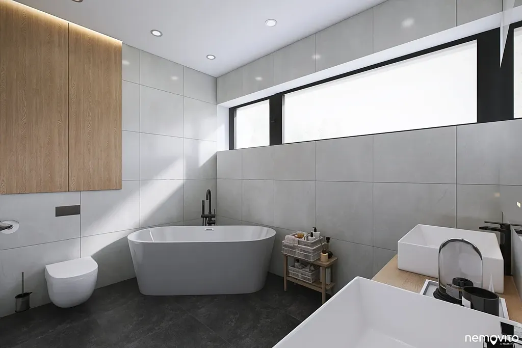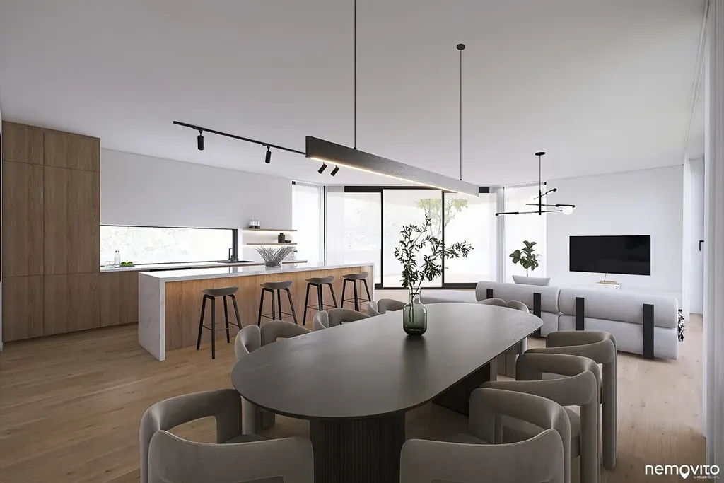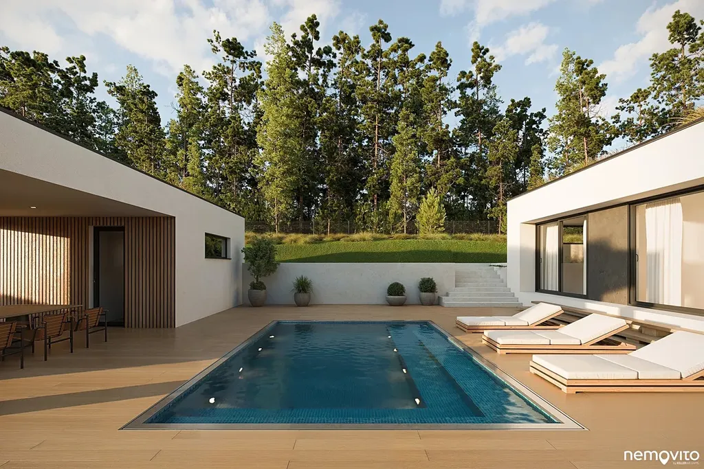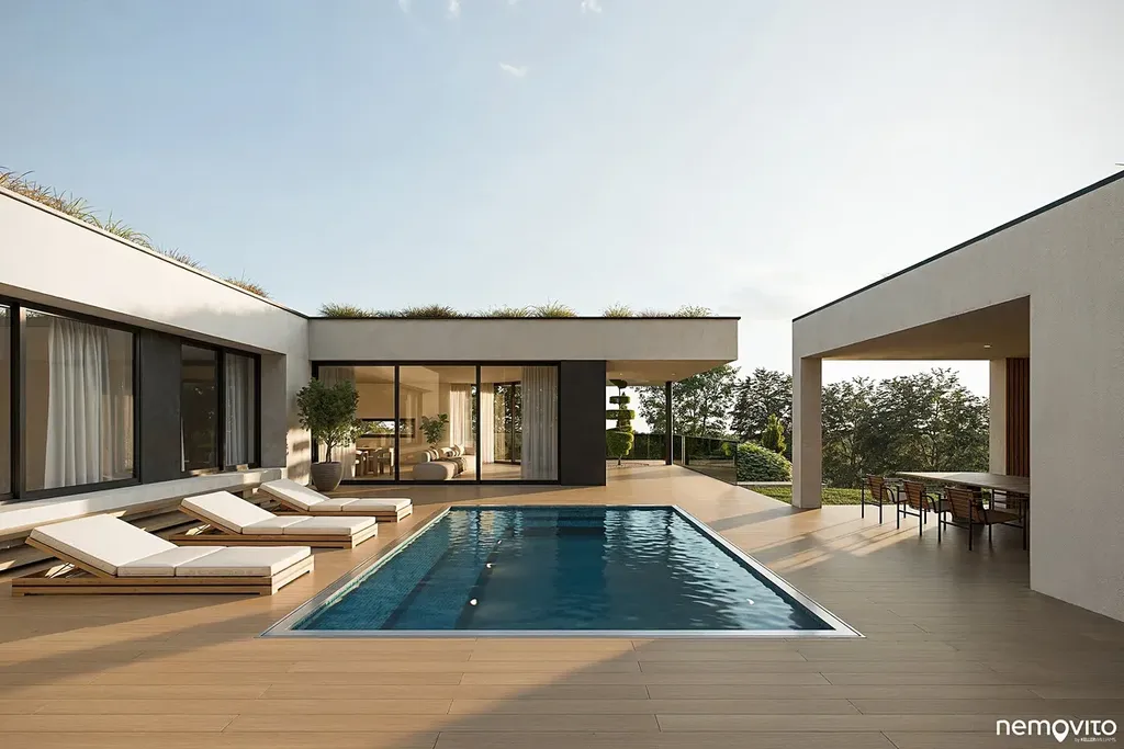 Dům o dispozici 5+kk (292 m2 plochy) nabízí ve 2 podlažích komfort, který nespočívá pouze ve velkorysé ploše, ale taktéž smysluplně řešené dispozici s téměř 100 metrovým suterénem. Vila, která svým pojetím navazuje na myšlenky funkcionalismu, hojně pracuje s velkou prosklenou plochou, která prostřednictvím precizně orientovaných výhledů těží maximum z konkrétního místa. Je zároveň navržena tak, aby od sousedního navrhovaného objektu maximálně filtrovala svůj provoz. Za tímto účelem vzniklo působivé vnitřní atrium s bazénem a letní kuchyní.