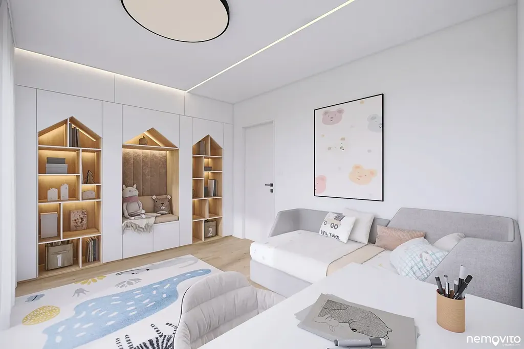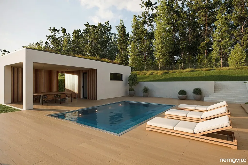 V úrovni příjezdu se nachází garáž na 2 auta a krytý přístřešek pro auto návštěv, dále nechybí sklad. Druhému podlaží dominuje téměř 60 m2 obývák s prosklením ze 3 stran. Ten nabízí přístup k atriu s bazénem nebo výstup na jižní krytou terasu, jejíž pojetí oživuje výřez střešní konstrukce pro umístění stromu. Severní část domu je věnována ložnicím a koupelnám, přičemž v jižní části domu nechybí ani pokoj pro hosty.